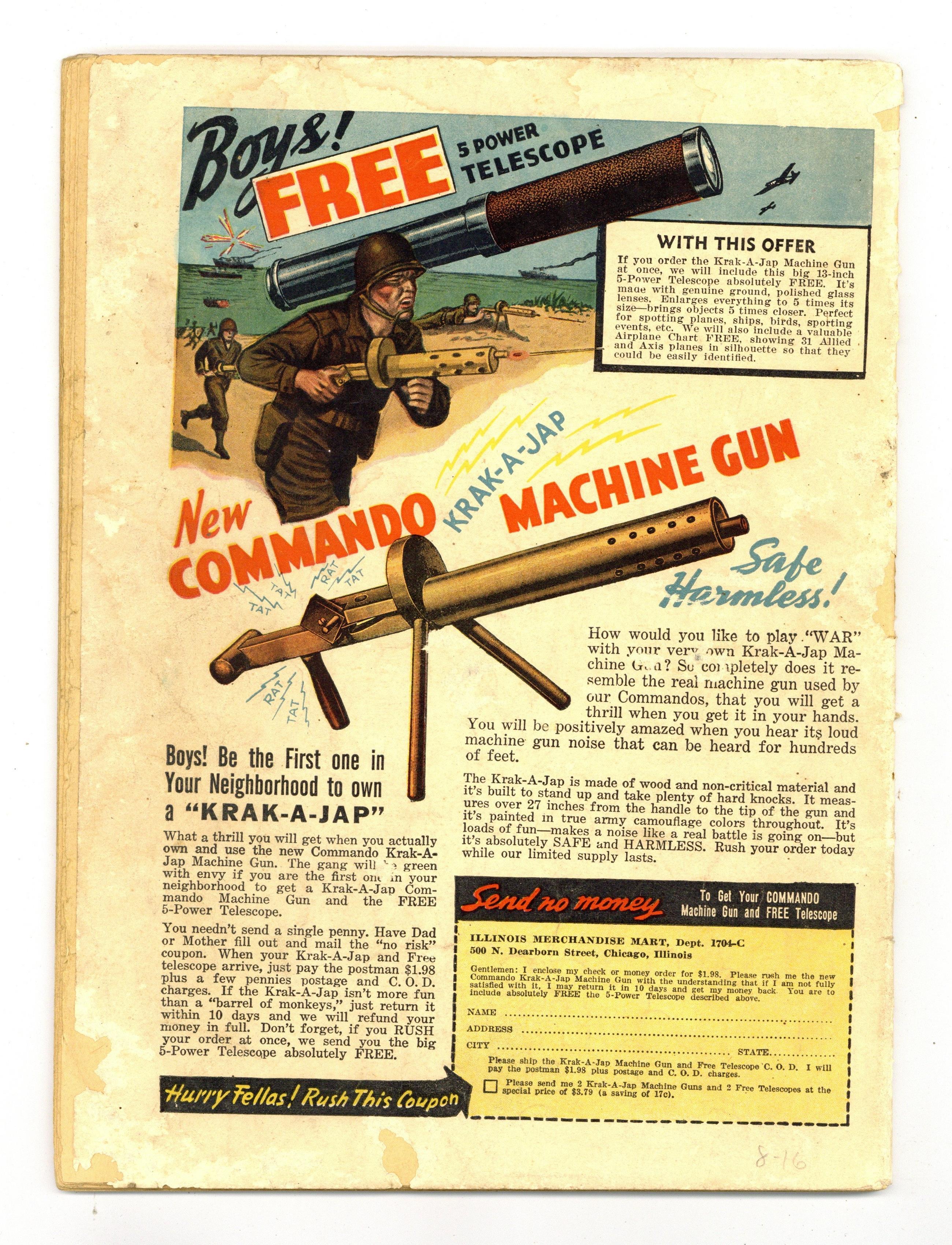 Edited by Ed Cronin. Stories by unknown. Art by Tony DiPreta, Bill Fraccio, Rudy Palais, Bob Fujitani and unknown. Heroic action stories of war and airborne adventure -- these are Air Fighters Comics! In this issue: A deadly gold locket that is Airboy's invitation to a "Dance of Death" (title from cover) in the sky! (Featuring the 1st and only appearance of the Black Ace.) Plus: untitled SkyWolf tale; untitled Skinny McGinty story with art by Tony DiPreta; untitled Iron Ace story (1st appearance of the Firebug) with art by Bill Fraccio; 2-page text story "Pilots in Dreamland"; "The Black Angel Vs. Miss Hun" (2nd appearance of Miss Hun) with art by Rudy Palais; 1-page paper drive feature "Skinny McGinty Says" with art by Tony DiPreta; and untitled Flying Dutchman tale with art by Bob Fujitani. 56 pages, full color. Cover price $0.10. Grade: GD- 1.8 explanation of grade Condition: Used (collectible)