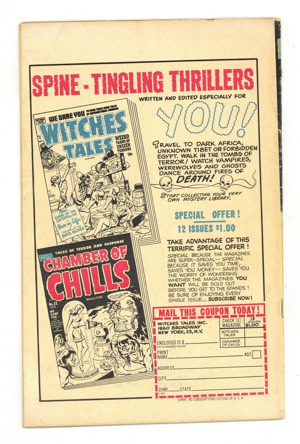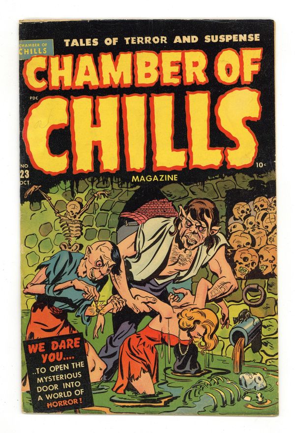 Cover by Al Avison. Stories and art by Bob Powell, Lee Elias, Pierce Rice, Vic Donohue and Rudy Palais. Sometimes listed as Chamber of Chills (1951 Harvey) #3. Harvey Comics joins the parade of pre-Code horror comics pioneered by EC in the 1950s. The recipient of an eye transplant is haunted by horrifying visions. A meek accountant pushed too far turns to murder, in a story with possible inks by comics legend Leonard Starr. Scientists discover the legendary lair of the Minotaur, but soon regret it. Arctic explorers accidentally unfreeze an evil temple and its inhabitants. Walking Dead; Hall Of Horror!; Trip To Terror; Brain Operation!; Strange Customs; Death In The Desert!; Monster's Maze; Scientific Oddities; The Doom of Living Ice; Weird Worlds. 36 pages, full color. Cover price $0.10. Grade: GD/VG 3.0 explanation of grade Condition: Used (collectible)