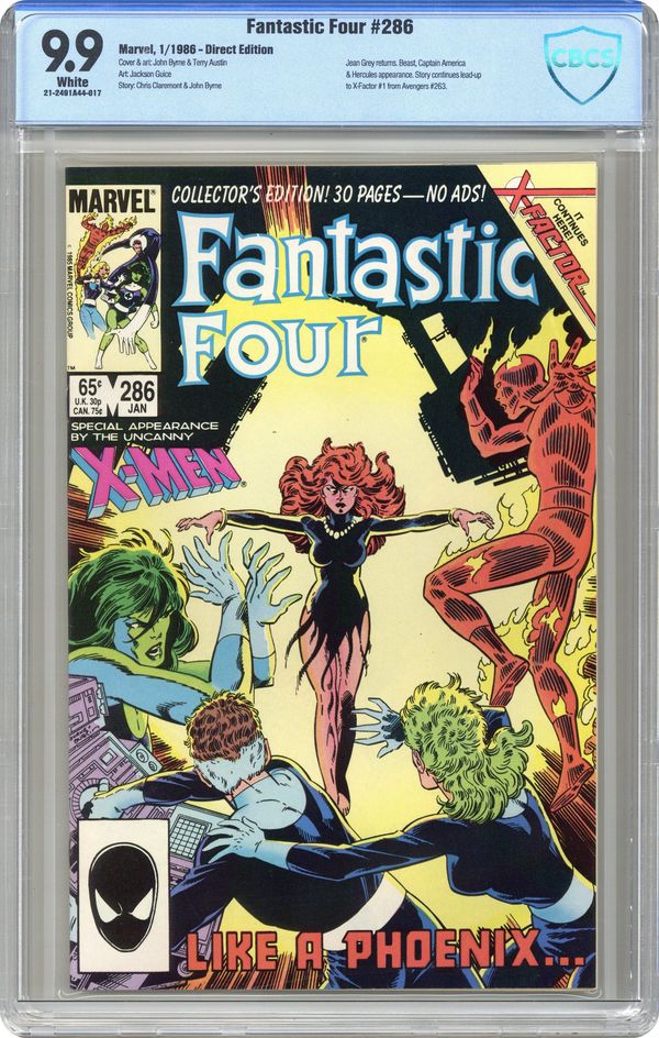 Ended Jun 30 2024 Winning Bid $194 Direct Edition. Last 65-cent issue. Return of Jean Grey: Part 2 of 3 - X-Factor tie-in. "Like a Phoenix!" Guest-starring the Uncanny X-Men and Avengers. Story by John Byrne. Art by John Byrne and Terry Austin. Cover by John Byrne. Story continued from Avengers (Vol. 1) #263. Don't miss the startling return of Jean Grey! How did she survive, and where has she been? The answers will shock and surprise you. Plus, this issue sets the stage for the return of the of the original X-Men! Story continues in X-Factor (1986-1998 1st Series) #1. 36 pgs. Cover price $0.65. Grade: CBCS 9.9 explanation of grade Condition: Used (collectible)