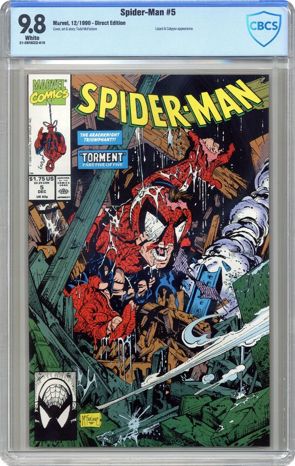 Ended Oct 26 2023 Winning Bid $29 Direct Edition. Direct Edition. Torment Part 5 of 5. "Torment" Script and art by Todd McFarlane. Cover by Todd McFarlane. At the end of last issue, the former mansion of Kraven the Hunter exploded -- with the wall-crawler, the Lizard, and Calypso inside! Miraculously, Spider-Man survived, but so did the Lizard! And It's going to take all the inner strength and courage the web-slinger can muster -- to put the Lethal Lizard down for the count! Can your friendly neighborhood Spider-Man do it? A frantic finish! Appearance by Mary Jane Watson. (Note: The Lizard returns in Amazing Spider-Man 365.) 32 pages. Cover price $1.75. Grade: CBCS 9.8 explanation of grade Condition: Used (collectible)