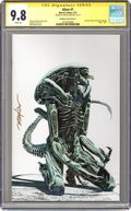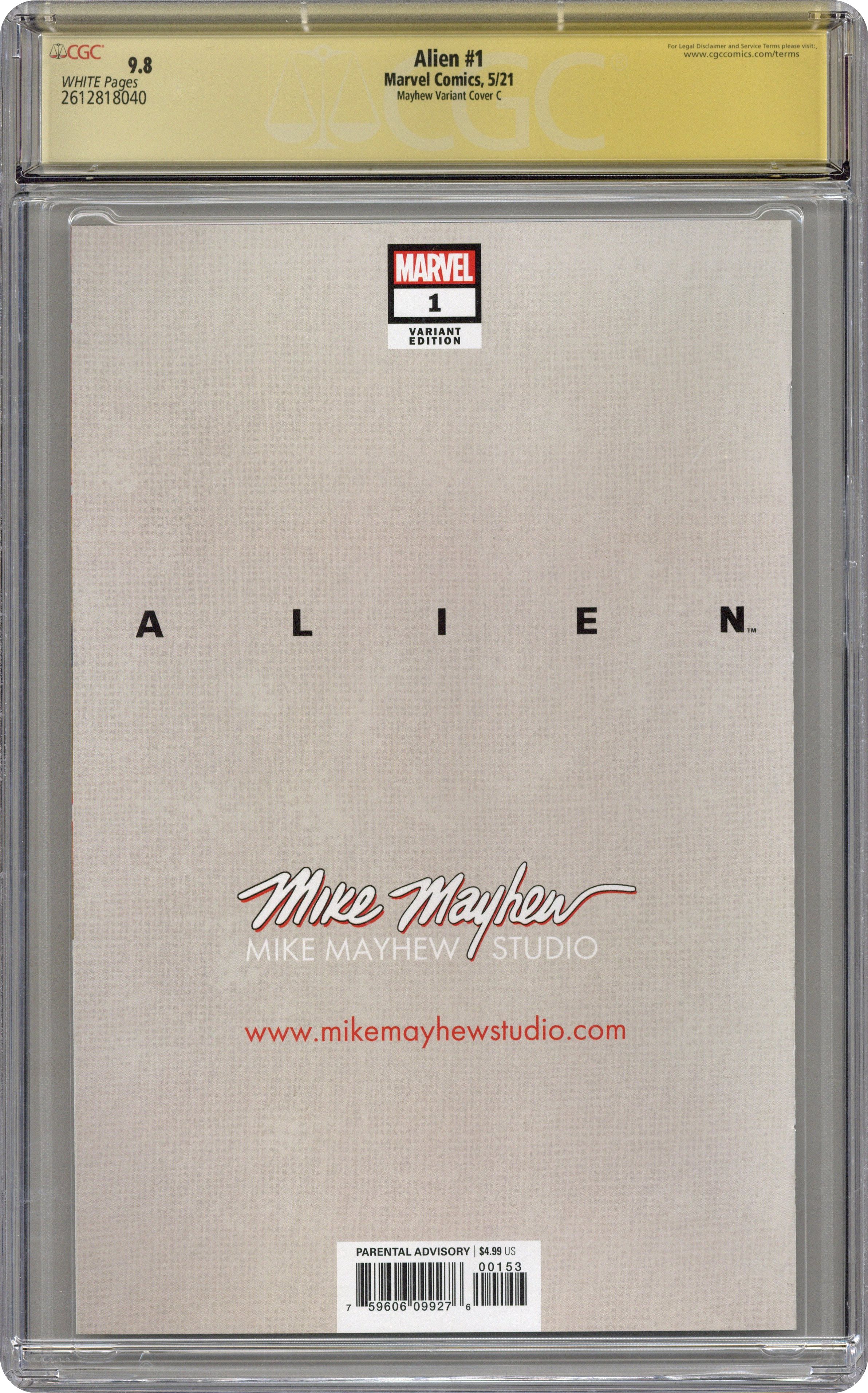 Mike Mayhew Studio "Spotlight" variant cover. Written by Phillip Kennedy Johnson. Art by Salvador Larroca. THE ICONIC CINEMATIC TERROR MAKES ITS MARVEL DEBUT! Gabriel Cruz gave his life to Weyland-Yutani--In the case of an alien attack he barely survived, almost literally! Recently retired, Cruz is trying to patch things up with his abandoned son with the help of his friend, a Bishop-model android, but his re-entry into civilian life is not going smoothly…and his encounters with the deadly Xenomorph are far from over. Phillip Kennedy Johnson and Salvador Larroca team up to tell an all-new tale of the titan of horror and science fiction that has scared audiences for decades. No one is safe. No one is innocent. And no one can hear you scream. 40 pages, full color. Parental Advisory Grade: CGC 9.8 explanation of grade Condition: Used (collectible)