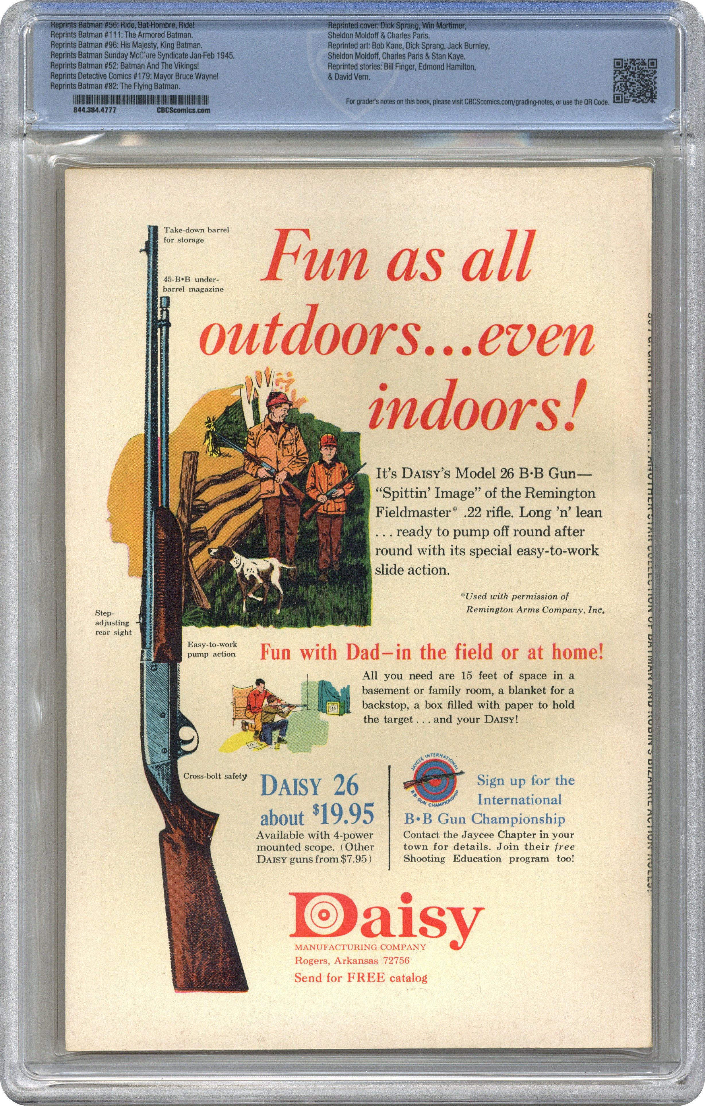 Ended Jun 28 2024 Winning Bid $93 Cover pencils by Dick Sprang, Win Mortimer, Sheldon Moldoff, inks by Charles Paris, Win Mortimer, and Sheldon Moldoff. "Ride, Bat-Hombre, Ride!", script by David Vern, pencils by Dick Sprang, inks by Charles Paris; The sickly Presidente of a Latin American nation implores the Caped Crusaders to come to his nation and train a Batman to keep law and order in his country. "The Armored Batman," script by Edmond Hamilton, pencils by Sheldon Moldoff, inks by Stan Kaye; All of Gotham City is puzzled by Batman and Robin's odd behavior and strange costuming when they hear of a man named Blair Graeme threatening the Caped Crusaders. "His Majesty, King Batman," script by Bill Finger, pencils by Sheldon Moldoff, inks by Charles Paris; A visiting royal dignitary visiting Gotham City gets an unexpected role he never expected: to play the role of Batman while the real Caped Crusader looks for a wanted felon. Make Your Summer Count! public service announcement, art by Sheldon Moldoff. "Batman and the Vikings!", pencils by Bob Kane, inks by Charles Paris; When Bruce and Dick visit the Gotham City museum, they note an image of a Viking that looks like Bruce Wayne...and who is labeled a coward, so they visit Carter Nichols to go back in time to discover the truth. "Mayor Bruce Wayne!", script by David Vern, pencils by Dick Sprang, inks by Charles Paris; Racketeer Deuce Chalmers has figured out that Bruce Wayne is Batman...the trouble is, how does he prove it?; And Bruce has troubles as well with his secret identity since he has been appointed temporary Mayor. "The Flying Batman", script by David Vern, pencils by Sheldon Moldoff, inks by Stan Kaye; Batman and Robin are rendered unconscious by a sting from a strange winged man, only to awake in a weird city inhabited by winged men, who want to operate on Batman to give him wings in order to track down desperate felons.. A complete Sunday newspaper syndicated story reprinted, script by Bill Finger, pencils by Jack Burnley, inks by Charles Paris. 84 Pages, Full Color. Cover price $0.25. Grade: CBCS 8.5 explanation of grade Condition: Used (collectible)