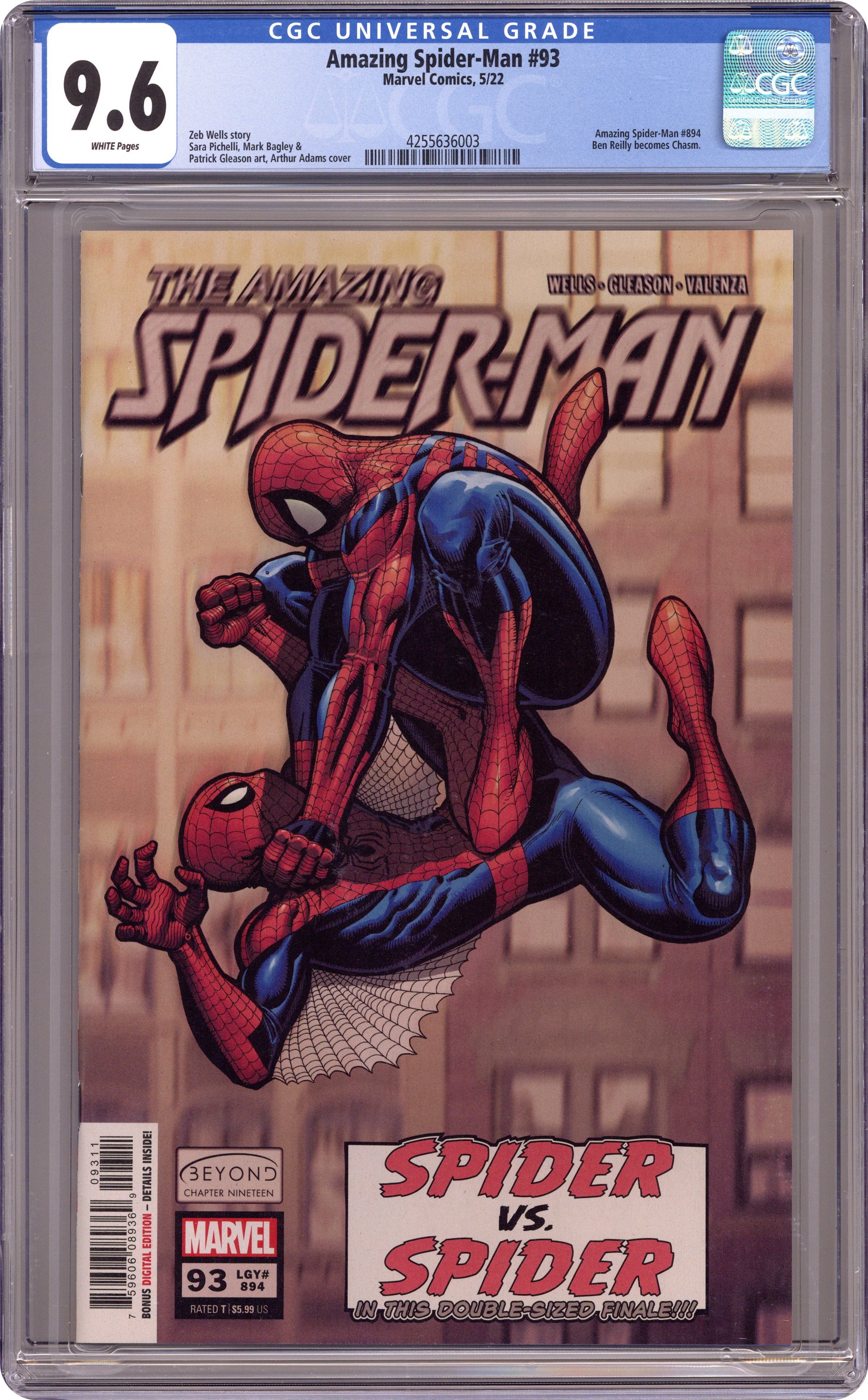 Ended Oct 24 2023 Winning Bid $22 Written by Zeb Wells. Art by Patrick Gleason. Cover by Arthur Adams. THE BIG FINALE OF "BEYOND"!!! SPIDER-MAN VS. SPIDER-MAN! You may surprise yourself with who you're rooting for. Don't miss the conclusion to one of the most surprising Spider-Stories of the past decade. 52 pages, full color. Rated T Cover price $5.99. Grade: CGC 9.6 explanation of grade Condition: Used (collectible)