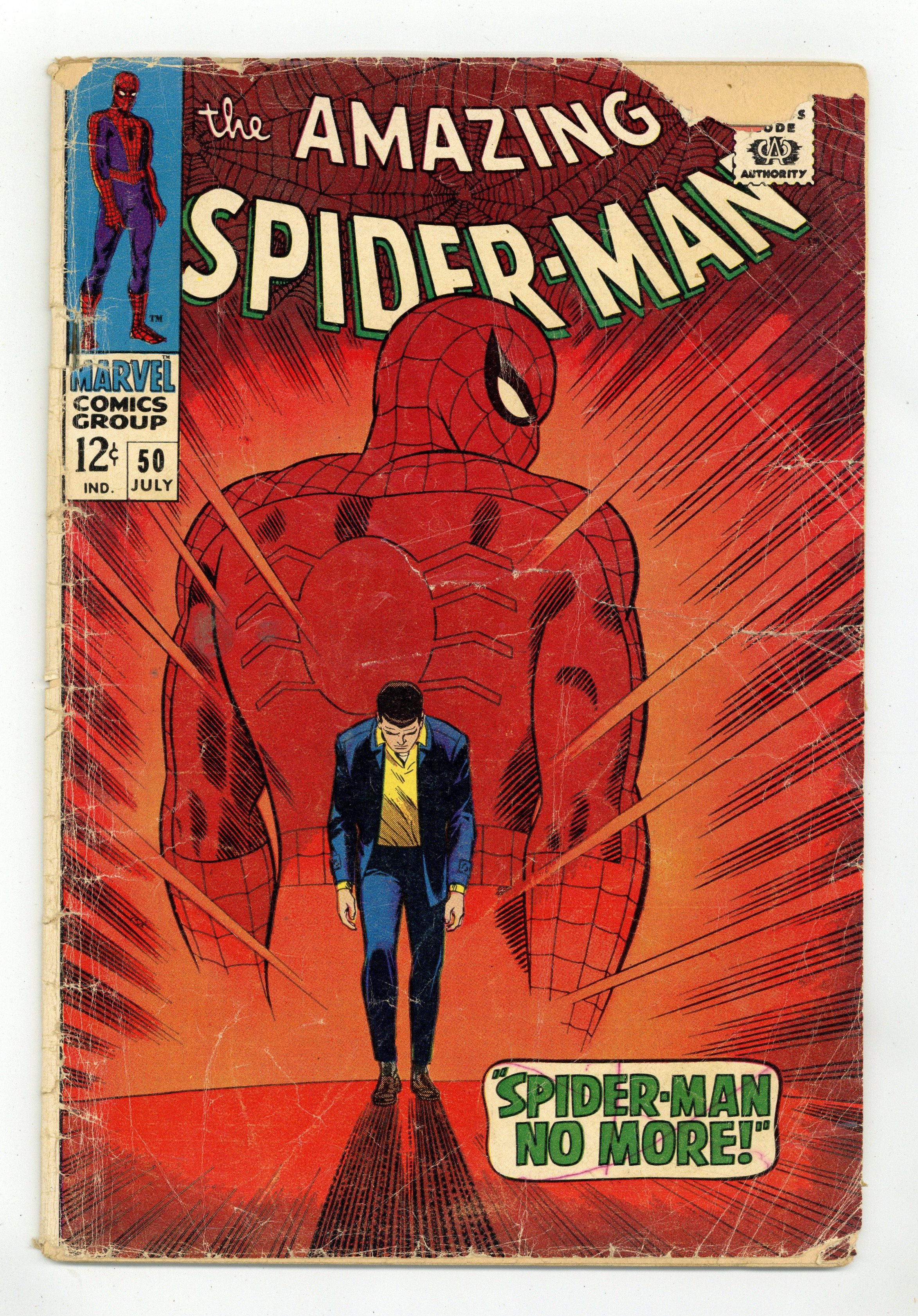 Cover pencils by John Romita. First appearance of the Kingpin in Spider-Man No More!, script by Stan Lee, pencils by John Romita, inks by Mike Esposito [as Mickey Dimeo]; Fearing for his aunt's health and tired of being hounded by Jameson, Peter gives up being Spider-Man and concentrates on being a simple college student; A kid finds the discarded Spidey suit in the trash can and brings it to the Daily Bugle where Jonah proudly puts it on display; Pete's personal life starts looking up but crime increases as the Kingpin gathers the mob under his leadership; Feeling guilty about the crime wave, Peter remembers the lessons taught to him by his uncle's death and decides to become Spider-Man once again. Johnny Carson and Ed McMahon cameos. Reprinted in Marvel Tales #190. 36 pgs. $0.12. Cover price $0.12. Grade: FR 1.0 explanation of grade Condition: Used (collectible)
