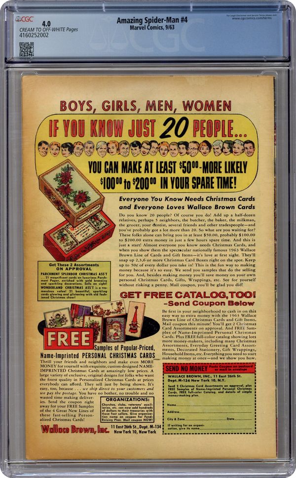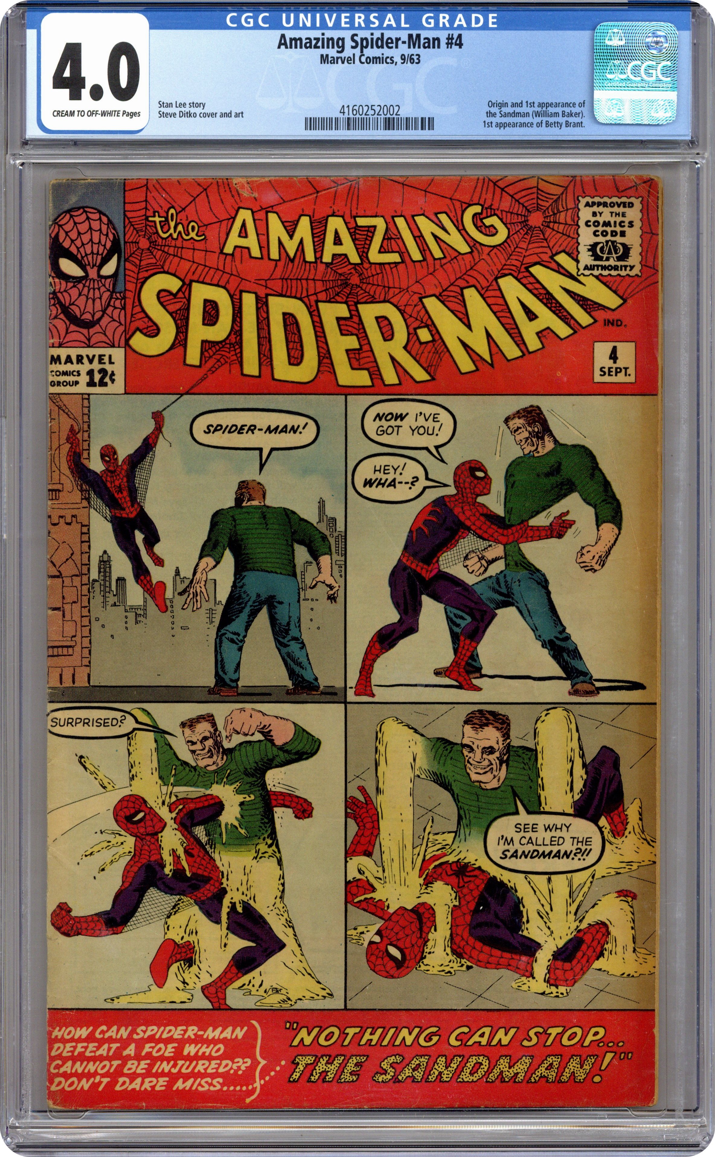 Cover art by Steve Ditko. First appearance of the Sandman in Nothing Can Stop The Sandman!, script by Stan Lee, art by Steve Ditko; The Sandman tries to hide from police in the high school where Peter Parker goes to school. Intro Betty Brant and Liz Allen. Reprinted in Marvel Tales # 141. 36 pgs. $0.12. Cover price $0.12. Grade: CGC 4.0 explanation of grade Condition: Used (collectible)