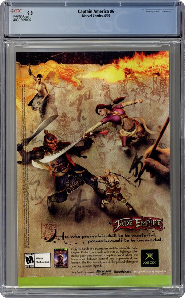 1st Full App. of Winter Soldier. Captain America Cover - Winter Soldier: Part 1.6 - Out of Time: Part 6 of 6 - Written by Ed Brubaker Pencils & Cover by Steve Epting. "OUT OF TIME" Finale Who killed the Red Skull? Who is the mystery assassin we have yet to see? This issue answers those questions and more! The hunt for the killer of the Red Skull takes a bizarre turn and Steve Rogers' life turns with it. Shattered fragments of Cap's past are called into question by new memories that keep flooding his mind. Is someone playing mind games with him, or has he been in the dark about certain events for years? Only a trip to the scene of his most devastating failure will answer that question. Part 6 (of 6). 32 PGS./Marvel PSR ...$2.99 Cover price $2.99. Grade: CGC 9.8 explanation of grade Condition: Used (collectible)