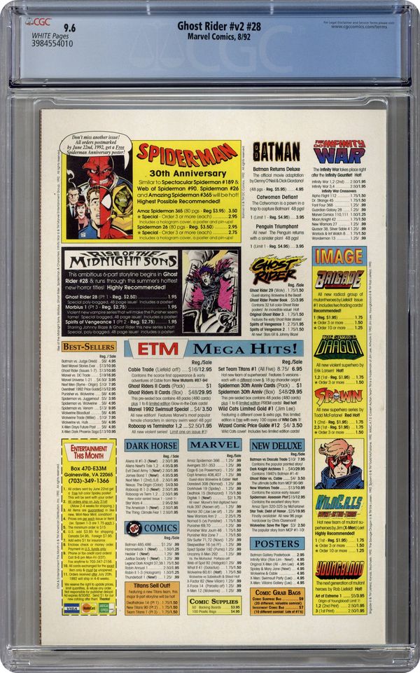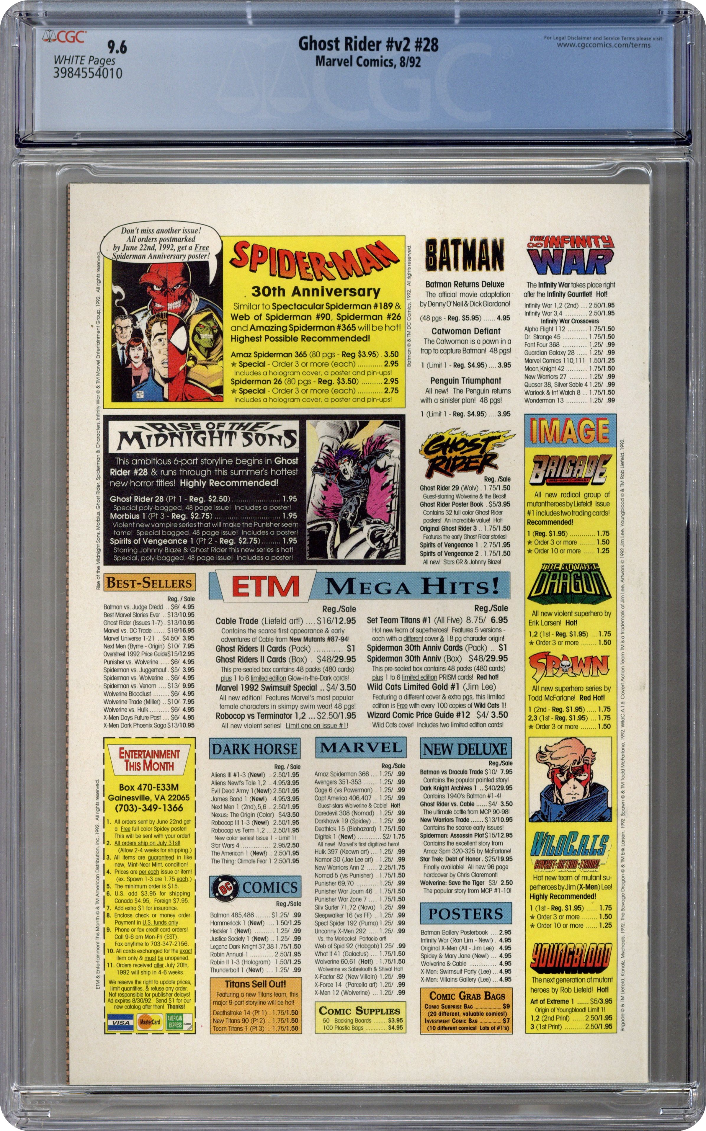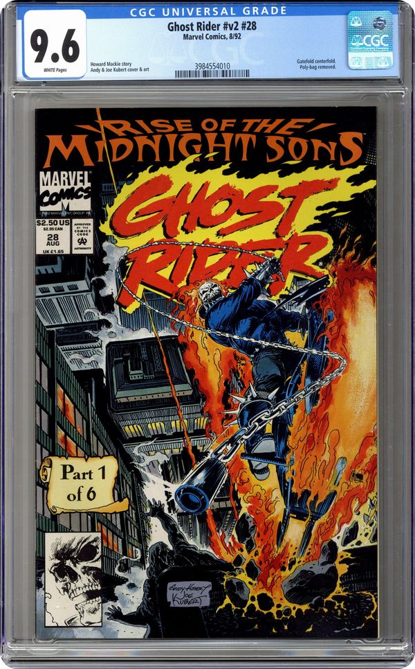 Direct Edition. Rise of the Midnight Sons: Part 1 of 6 - " Visions!" Guest-starring Doctor Strange. Written by Howard Mackie. Art by Andy Kubert and Joe Kubert. Ghost Rider captures two criminals who murdered an elderly woman and deposits them in the mausoleum where he has kept Blackout, Stern, and dozens of other criminals captive. At the Ketch house, Stacy and Gerard Dolan console Francis Ketch over Dan's disappearance. Dolan then gets a call that the police are about to arrest Ghost Rider and leaves to assist. At the cemetery, a man calling himself the Caretaker greets Johnny Blaze and Ghost Rider and tells them the police have surrounded the cemetery. Ghost Rider opens the mausoleum to find all of his captives dead, and, within the void, Dan's spirit experiences a vision given to him by Lilith of an assemblage of supernatural heroes. Blackout and Stern emerge from the crypt and Blackout bites Ghost Rider, causing to experience Lilith's vision as well. Blackout realizes Lilith is his mother and vows to find her. Blackout and Stern flee the mausoleum amidst police gunfire. Michael Badilino, the officer in charge, enters the mausoleum to arrest Ghost Rider, but Caretaker hits him with a shovel and leads Ghost Rider and Blaze through underground tunnels to an unoccupied section of the cemetery. Blackout attempts to flee on a bike Blaze stored in the cemetery, but flees on foot when Blaze sets the bike ablaze hellfire. Blaze, on the flaming bike, and Ghost Rider leave to meet with the Quentin Carnival in Rhode Island, and Caretaker asks the arriving Doctor Strange if he believes he can defeat Lilith. Story continues in Ghost Rider/Blaze: Spirits of Vengeance (1992) #1. 32 pages, FC. Cover price $2.50. Grade: CGC 9.6 explanation of grade Condition: Used (collectible)