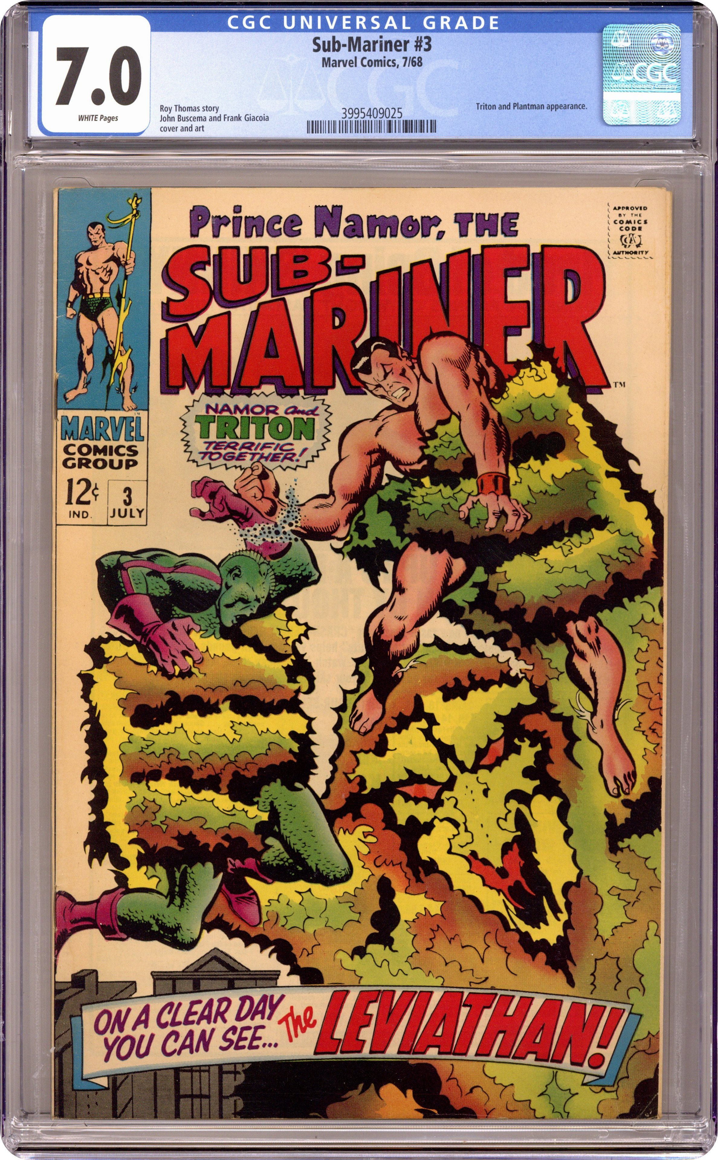 Ended Oct 3 2023 Winning Bid $38 "On a Clear Day You Can See the Leviathan!" Guest-starring Triton. Written by Roy Thomas. Art by John Buscema and Frank Giacoia. can even the Savage Sub-Mariner and the uncanny Inhuman Triton stop the mad scheme of the diabolical Plant Man? 32 pages, FC. Cover price $0.12. Grade: CGC 7.0 explanation of grade Condition: Used (collectible)