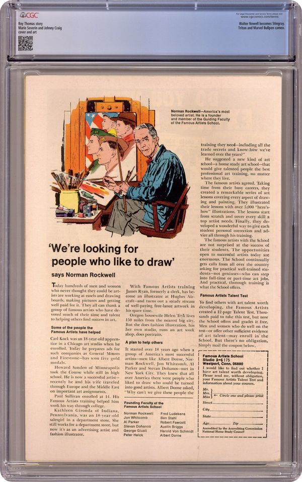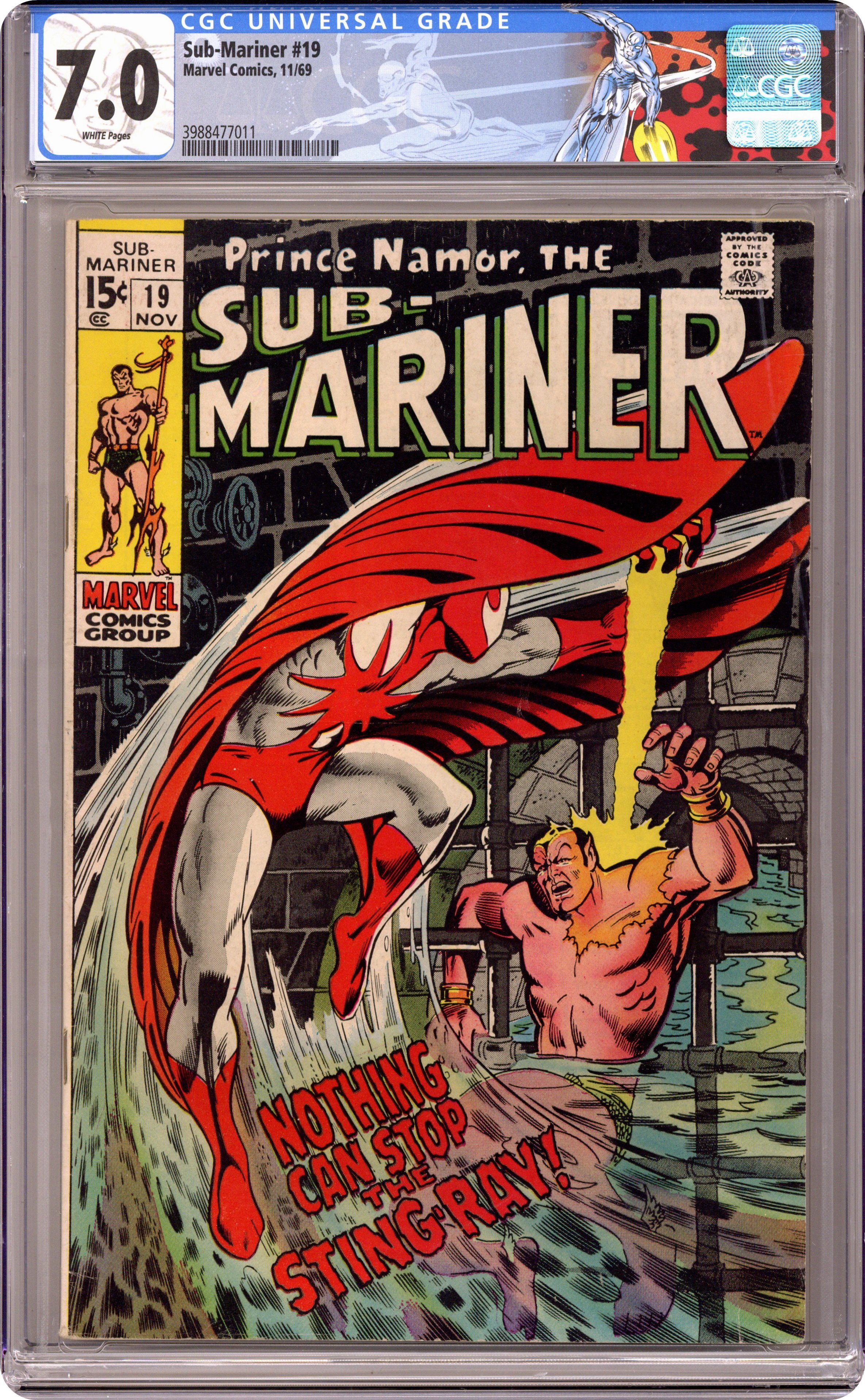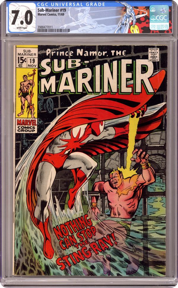Cover pencils by Marie Severin, inks by Johnny Craig. 1st appearance of Sting Ray in "Support Your Local Sting-Ray," script by Roy Thomas, pencils by Marie Severin, inks by Johnny Craig; Namor learns that he has lost his ability to fly and to breathe underwater; Taken by surprise, he's captured by the costumed adventurer Sting-Ray and turned over to the authorities; Namor escapes, but is pursued by Sting-Ray until he's able to convince Sting-Ray that he isn't as evil as the government claims. 36 pgs., full color. $0.15. Cover price $0.15. Grade: CGC 7.0 explanation of grade Condition: Used (collectible)