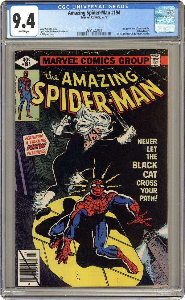 Ended Oct 16 2023 Winning Bid $538 Direct Edition. First appearance of the Black Cat in "Never Let The Black Cat Cross Your Path!" Part 1 of 2. Script by Marv Wolfman. Art by Keith Pollard (breakdowns) and Frank Giacoia (finishes). Cover by Al Milgrom. One of the landmark issues of the Amazing Spider-Man series! The dazzling debut of the Black Cat! The wall-crawler has spent the first 193 issues of his title chasing super-villains! But tonight he's going to kiss one instead! Wow! Does the web-slinger stand a chance against the beauty and charm of Felicia Hardy? Not when the alluring cat has his tongue! And maybe later his heart! A terrific issue! Cameo appearances by Aunt May, Betty Brant, Ned Leeds, Harry Osborn, Flash Thompson, Mysterio (in civilian clothes), and the burglar. (Notes: The Black Cat is the creative highlight of the Wolfman-Pollard run on the Amazing Spider-Man title. Dave Cockrum designed the cat's costume. The letters page includes an alternate cover (for issue 194) by Keith Pollard. It also includes an alternate cover to Spider-Woman 9 by Carmine Infantino. This two-part story was reprinted in the trade paperback: Spider-Man vs. the Black Cat (2005). 36 pages, full color. Cover price $0.40. Grade: CGC 9.4 explanation of grade Condition: Used (collectible)