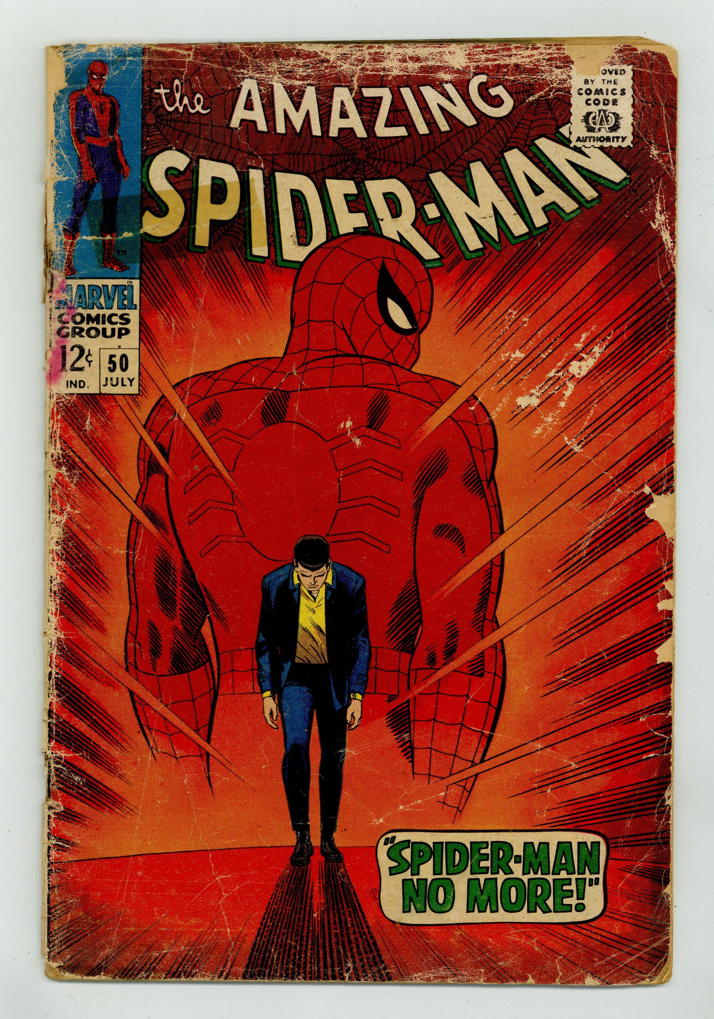 Cover pencils by John Romita. First appearance of the Kingpin in Spider-Man No More!, script by Stan Lee, pencils by John Romita, inks by Mike Esposito [as Mickey Dimeo]; Fearing for his aunt's health and tired of being hounded by Jameson, Peter gives up being Spider-Man and concentrates on being a simple college student; A kid finds the discarded Spidey suit in the trash can and brings it to the Daily Bugle where Jonah proudly puts it on display; Pete's personal life starts looking up but crime increases as the Kingpin gathers the mob under his leadership; Feeling guilty about the crime wave, Peter remembers the lessons taught to him by his uncle's death and decides to become Spider-Man once again. Johnny Carson and Ed McMahon cameos. Reprinted in Marvel Tales #190. 36 pgs. $0.12. Cover price $0.12. Grade: FR 1.0 explanation of grade Condition: Used (collectible)
