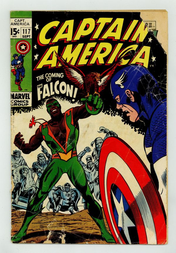 Cover pencils by Gene Colan and John Romita (alterations), inks by Joe Sinnott and John Romita (alterations). First appearance and origin of the Falcon in "The Coming of... the Falcon!", script by Stan Lee, pencils by Gene Colan, inks by Joe Sinnott; With the Red Skull previously having switched bodies with Captain America, the Skull uses the Cosmic Cube to send Cap to the tropical island home of the Exiles; There Cap encounters a falconer from Harlem who had been hired by the Exiles but who is now attempting to help the island natives kick the Exiles from their home; Cap joins forces with the falconer who, with Cap's urging, dons a costume and takes the name the Falcon. Letter to the editor from writer James Van Hise. 36 pgs., full color. $0.15. Cover price $0.15. Grade: FR/GD 1.5 explanation of grade Condition: Used (collectible)