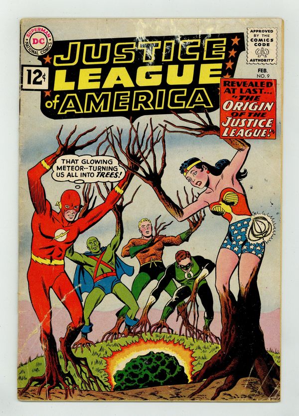 Cover pencils by Mike Sekowsky, inks by Murphy Anderson. The Origin of the Justice League!, script by Gardner Fox, pencils by Mike Sekowsky, inks by Bernard Sachs; The Justice League of America uses the occasion of its third anniversary to tell Snapper Carr and Green Arrow about the formation of the League, involving the discovery of strange meteors that nearly doomed them forever; featuring the origin and first case of the JLA. Letter to the editor from comic artist Joe Staton. 36 pgs. $0.12. Cover price $0.12. Grade: GD+ 2.5 explanation of grade Condition: Used (collectible)