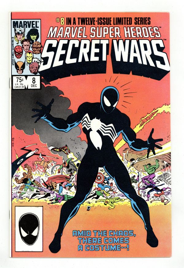 Direct Edition. "Invasion!" Part 8 of 12. Story by Jim Shooter. Art by Mike Zeck, John Beatty, Jack Abel, and Mike Esposito. Tired of being the villains' punching bags, the heroes take the fight to their deadly foes' own doorstep. What follows is one of the most titanic super hero/villain tussles of all time. Plus, Spidey gets a new costume. 1st in continuity appearance of Spider-Man's black costume. See Amazing Spider-Man (Vol. 1) #252, Marvel Team-Up #141, & Spectacular Spider-Man #90 for the first appearances from 7 months earlier. NOTE: This costume turns out to be an alien symbiote that will later bond with Eddie Brock and become the tenacious Spidey villain known as Venom. See Amazing Spider-Man #300. 36 pages, full color. Cover price $0.75. Grade: VF 8.0 explanation of grade Condition: Used (collectible)