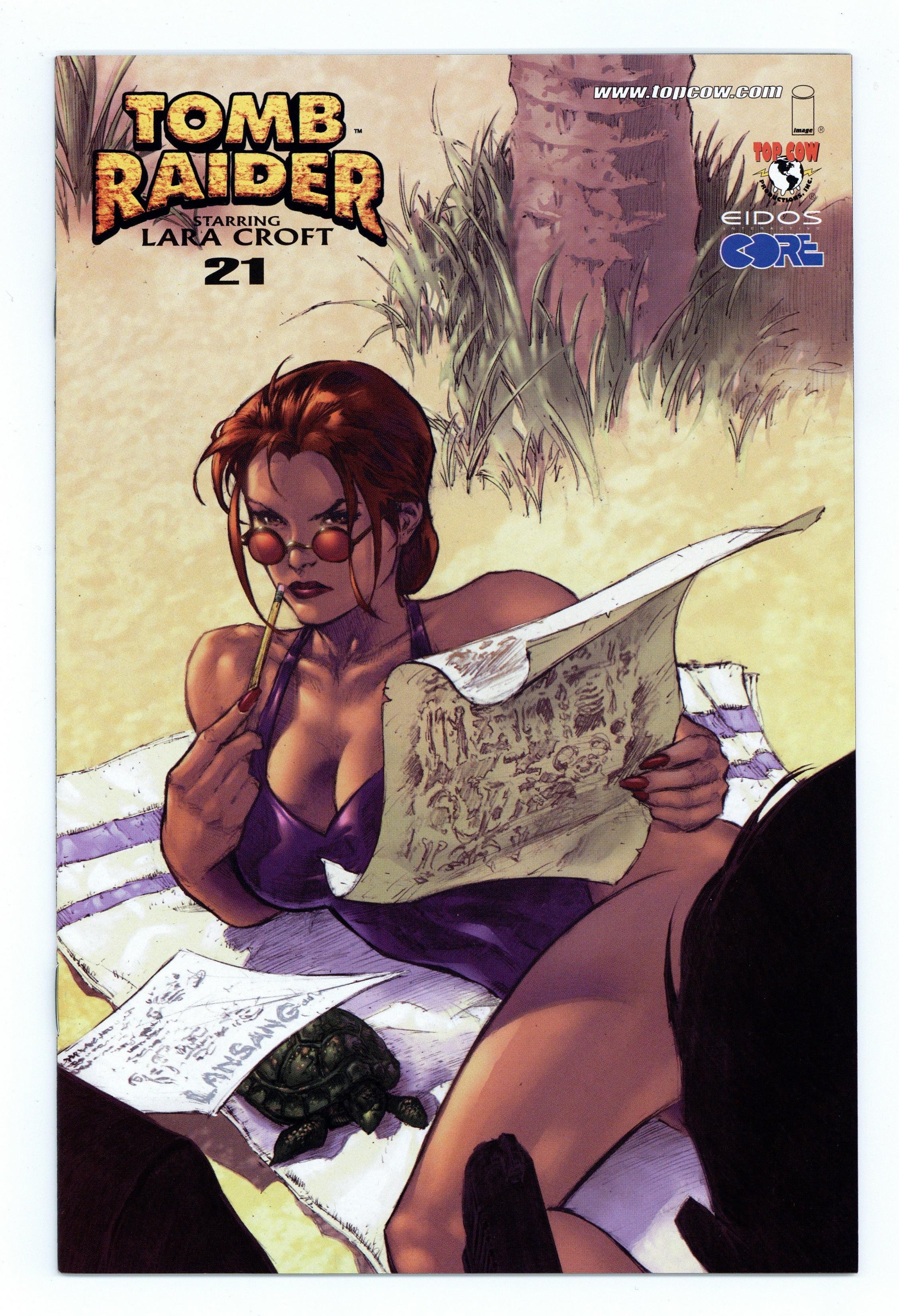 Ended Dec 20 2023 Winning Bid $135 Dealer incentive variant cover, Lara lying on towel. Cover by Andy Park, Jonathan Sibal, and Jonathan D. Smith. Path of the Tiger: The Trap, script by John Ney Rieber, art by Randy Green and Jonathan Sibal; The Concept: One of the most popular characters in video game history, Lara Croft is a little bit Indiana Jones, a little bit Playboy playmate, and enough action and adventure to snare an entire generation of fans with her continuing adventures; This Issue: Follow Lara high in Tibet to the Taktsang Ravine where she searches for the Black Mandala; A new artistic team starts their run with this well-loved character and they're bringing even more of the signature game moves and puzzles to the book; John Ney Reiber and Randy Green guarantee to make this an exciting and sexy time in the life of Lara Croft! 36 pgs., full color. Cover price $2.50. Grade: VF/NM 9.0 explanation of grade Condition: Used (collectible)