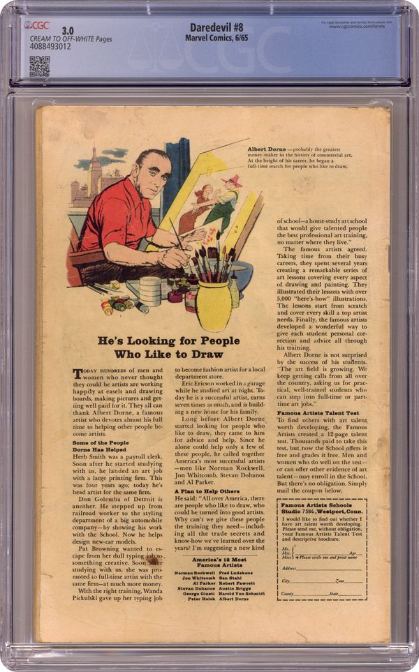 Cover art by Wally Wood. First appearance of the Stilt-Man in The Stilt-Man Cometh!, script by Stan Lee, art and cover by Wally Wood; Nelson and Murdock are hired by a disgruntled scientist who claims his boss stole his invention; The scientist turns out, not only to be the real thief, but also the new villain, Stilt-Man. House ad for Fantastic Four #40 and Amazing Spider-Man #26. Letter by artist Alan Hutchinson. 36 pgs. Cover price $0.12. Cover price $0.12. Grade: CGC 3.0 explanation of grade Condition: Used (collectible)