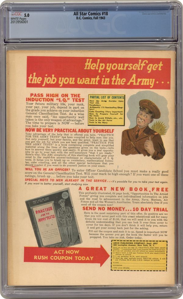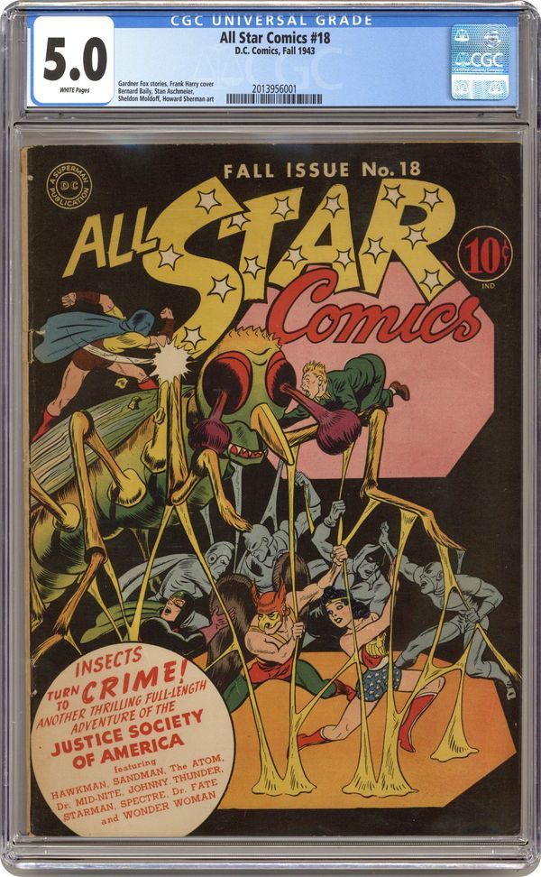 Fall 1943. The Justice Society of America has its hand full when "Insects Turn to Crime!" Plot by Gardner Fox and Sheldon Mayer, script by Fox. Art by Joe Gallagher plus individual chapters featuring Hawkman (art by Sheldon Moldoff), the Sandman (art by Pierce Rice and Arthur Cazenueve), the Spectre (art by Bernard Baily), Doctor Fate (art by Howard Sherman), Dr. Mid-nite (art by Stan Aschmeier), Starman (art by Rice/Cazenueve), the Atom (art by Gallagher), and Johnny Thunder (art by Aschmeier). Wonder Woman cameo. Full-page ad for the Junior Justice Society of America fan club. Combined full-page ad for Wonder Woman 6, Comic Cavalcade 4, All-Flash 12, and Green Lantern 9. Frank Harry cover. 60 Pages, Full Color. Cover price $0.10. Grade: CGC 5.0 explanation of grade Condition: Used (collectible)