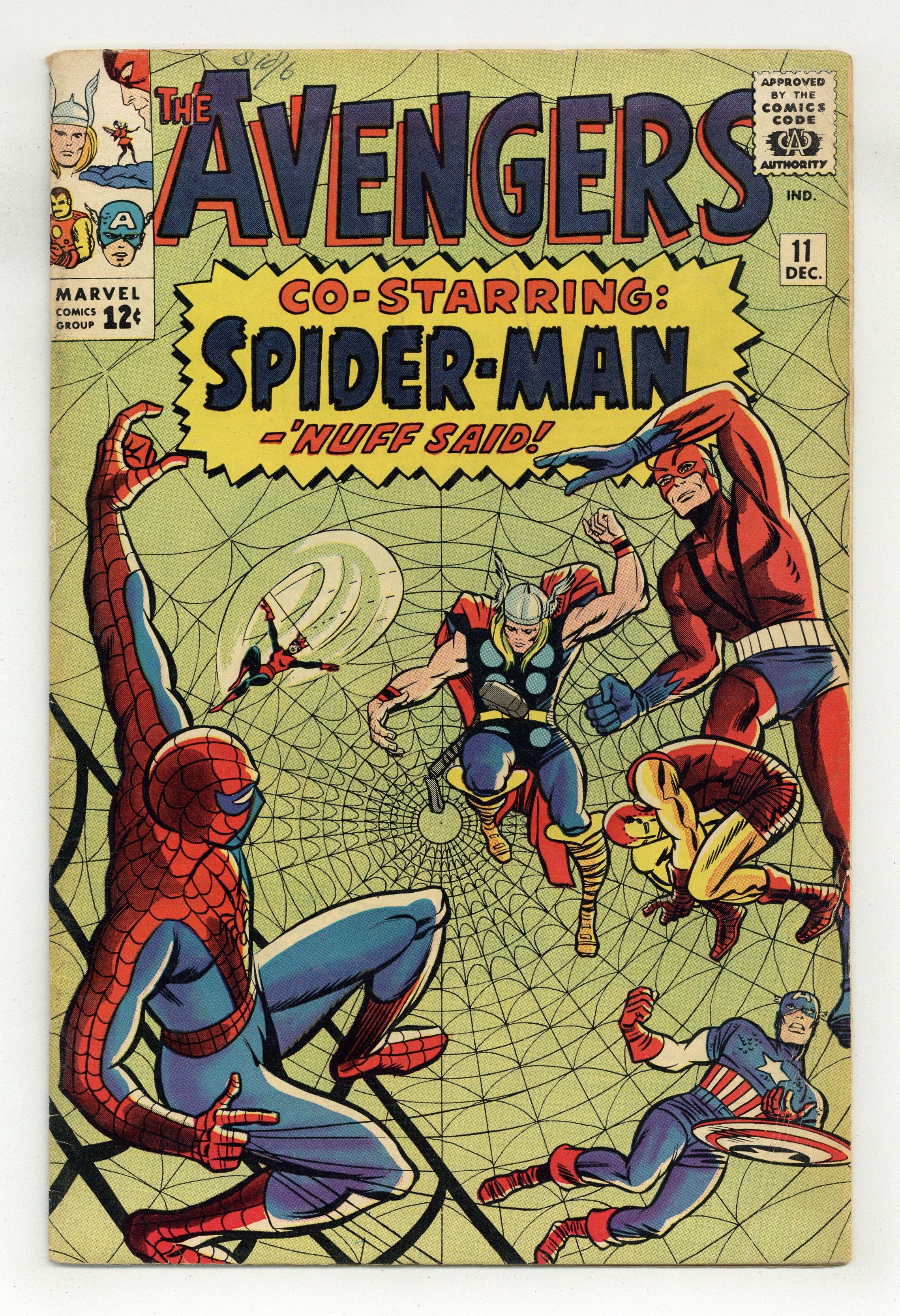 Cover pencils by Jack Kirby, inks by Chic Stone. The Mighty Avengers Meet Spider-Man, script by Stan Lee, pencils by Don Heck, inks by Chic Stone; Kang creates a robotic Spider-Man and sends him back in time to battle the Avengers. Roster: Captain America, Thor, Giant-Man, Wasp, and Rick Jones. Guest stars the Amazing Spider-Man. Villain: Kang. Cameo appearances by Zemo, the Executioner, Wonder Man, Dr. Doom, Magneto, Mysterio, the Unicorn, and Kraven the Hunter (all in Kang's files). Kang pin-up. 36 pgs. $0.12. Cover price $0.12. Grade: PR 0.5 explanation of grade Condition: Used (collectible)
