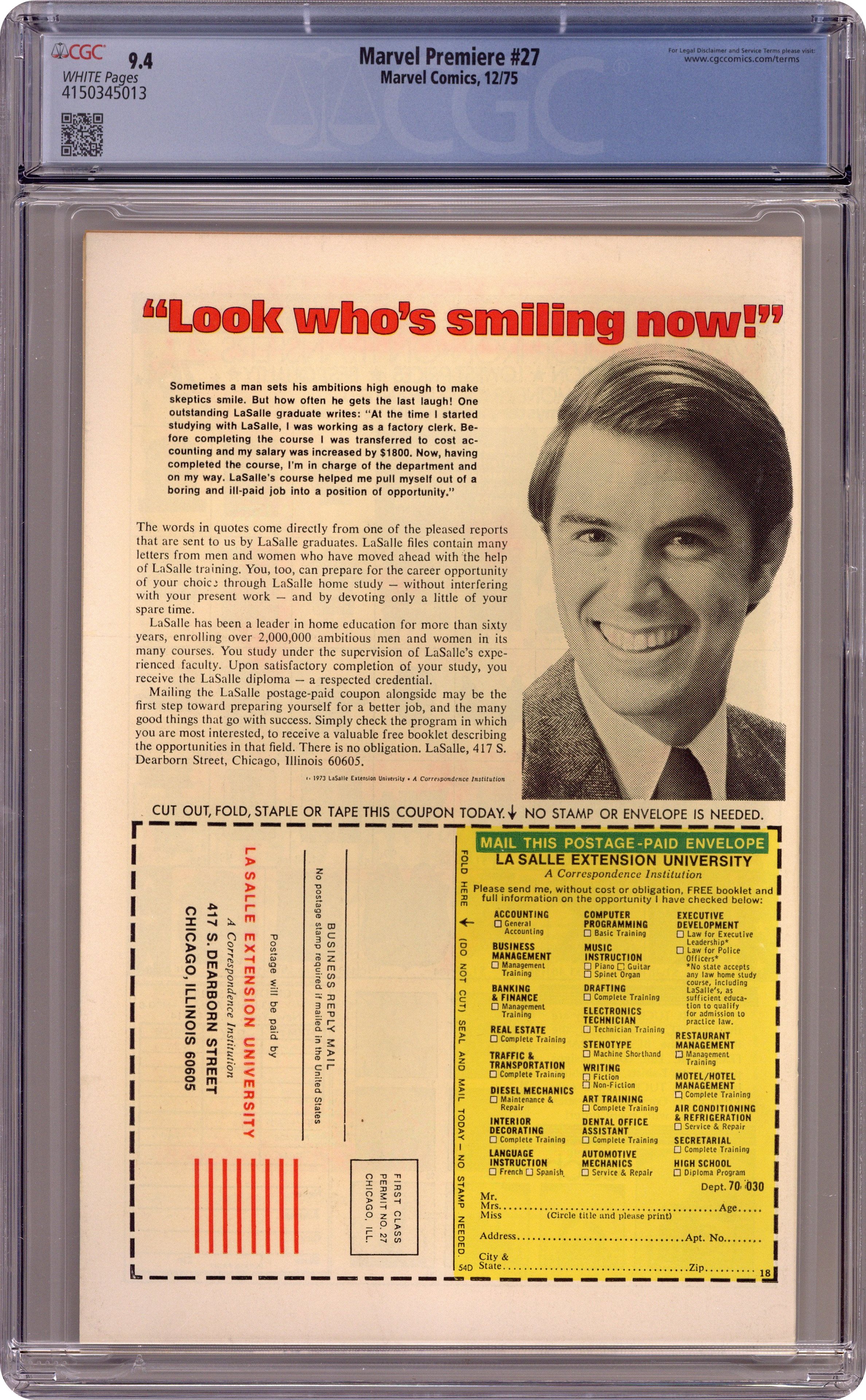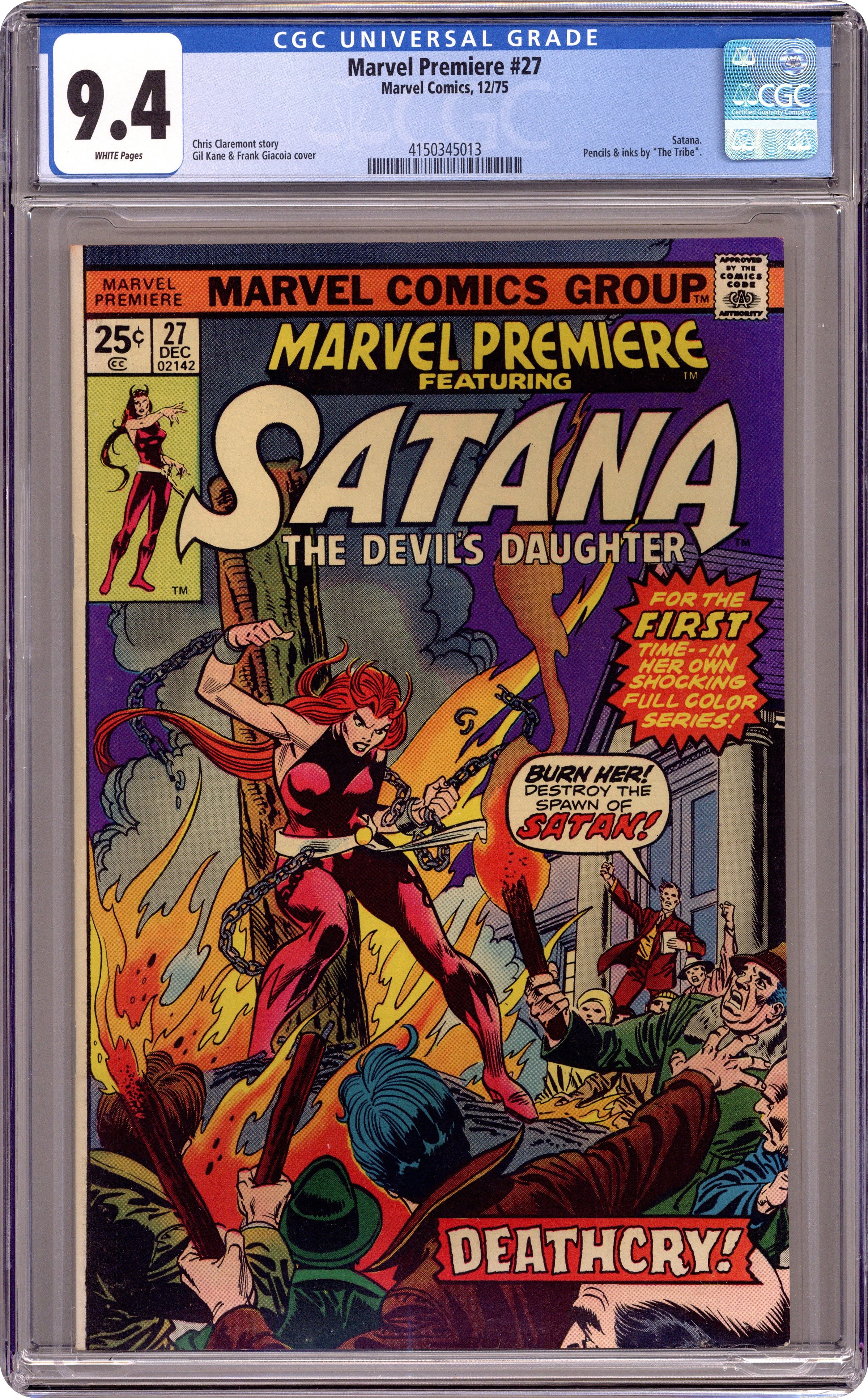 "Deathsong" Chris Claremont script. Art by The Tribe and Janice Cohen. First full-color solo story featuring Satana. While traveling through California, Satana encounters a young woman who's being chased by a mob claiming she's a witch. However, Satana gets more than she bargained for after she has the woman freed. Also included is a back-up reprint story of Satana's first appearance from Vampire Tales #2. 32 pgs. Full color. 25 cent cover price. Cover price $0.25. Grade: CGC 9.4 explanation of grade Condition: Used (collectible)