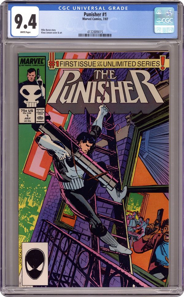 Direct Edition. Story by Mike Baron. Art by Klaus Janson. Vietnam vet Frank Castle's wife and children were caught in the crossfire of warring crime families. Now, he's back and they're all going to pay. All of them. Those that visit harm on others will come to know him as the Punisher. Frank starts up his first ongoing series with guns blazing. His first target, a drug dealer who thinks he's above the law. Well, he's not above Punishment. Cover price $0.75. Grade: CGC 9.4 explanation of grade Condition: Used (collectible)