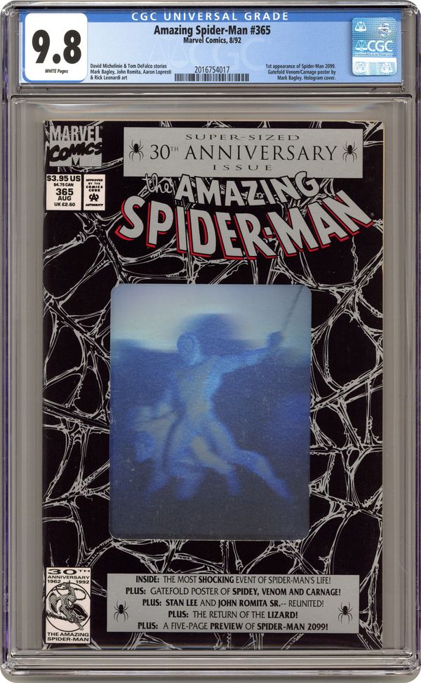 Ended Feb 19 2024 Winning Bid $130 Direct Edition. 80-page giant 30th Anniversary issue, with the first appearance of Spider-Man 2099! The Lizard returns in "Fathers and Sins." Script by David Michelinie, pencils by Mark Bagley, inks by Randy Emberlin. J. Jonah Jameson is featured in "How I Created Spider-Man!" Script by David Michelinie, art by Aaron Lopresti. Gwen Stacy takes center stage in "I Remember Gwen." Script by Stan Lee, plot by Tom DeFalco, art by John Romita Sr. (Cameos by the Green Goblin and Doctor Octopus.) The Prowler is also here in "A Friend in Need." Script by Tom DeFalco, pencils by Tod Smith, inks by Andrew Pepoy. There are also two text pieces, "The Saga of Spidey's Parents" by Stan Lee, and "Spider-Man: The First Thirty Years" by Peter Sanderson. Spider-Man 2099 gets a sneak preview, with a script by Peter David, pencils by Rick Leonardi, and inks by Al Williamson. This issue was originally released with a fold-out poster of Spidey versus Venom and Carnage (poster may be missing in lower grades). 84 pgs. Cover price $3.95. Grade: CGC 9.8 explanation of grade Condition: Used (collectible)