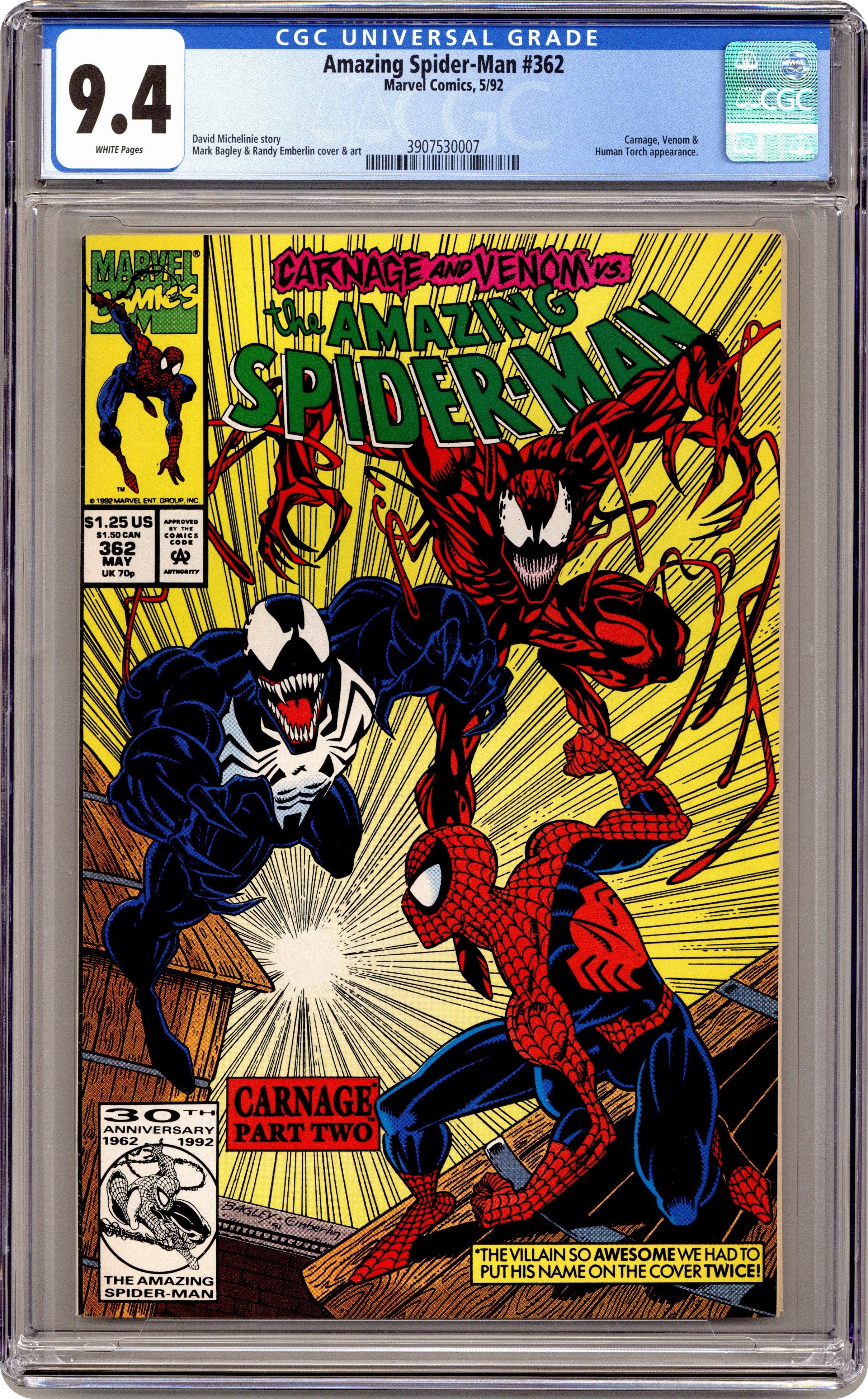 Ended Feb 13 2024 Winning Bid $36 First Printing. Direct Edition. "Savage Alliance!" Part 2 of 3. Guest-starring the Human Torch. Script by David Michelinie. Pencils by Mark Bagley. Inks by Randy Emberlin. Cover by Mark Bagley and Randy Emberlin. After getting a taste of Carnage's raw power last issue, the wall-crawler knows he needs serious help! To that end the amazing one does the unthinkable! He pays a visit to Venom! Wow, is that a good idea? However as a precaution the web-slinger brings Johnny Storm along for the ride to Venom's deserted island! And following an intense battle, Venom surprisingly agrees to help his good pal Spidey! So in a truly unlikely pairing, the Spectacular Spider-Man and the Lethal Protector join forces to take down Carnage! You have to see it to believe it! Cameo appearance by J. Jonah Jameson. (Note: The issue includes a full-page ad for the Toxic Crusaders (1992) series with art by Sam Kieth.) 36 pages. $1.25 cover price. Cover price $1.25. Grade: CGC 9.4 explanation of grade Condition: Used (collectible)