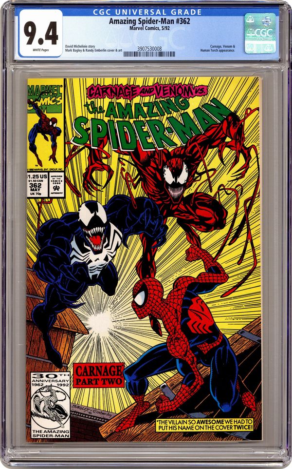 First Printing. Direct Edition. "Savage Alliance!" Part 2 of 3. Guest-starring the Human Torch. Script by David Michelinie. Pencils by Mark Bagley. Inks by Randy Emberlin. Cover by Mark Bagley and Randy Emberlin. After getting a taste of Carnage's raw power last issue, the wall-crawler knows he needs serious help! To that end the amazing one does the unthinkable! He pays a visit to Venom! Wow, is that a good idea? However as a precaution the web-slinger brings Johnny Storm along for the ride to Venom's deserted island! And following an intense battle, Venom surprisingly agrees to help his good pal Spidey! So in a truly unlikely pairing, the Spectacular Spider-Man and the Lethal Protector join forces to take down Carnage! You have to see it to believe it! Cameo appearance by J. Jonah Jameson. (Note: The issue includes a full-page ad for the Toxic Crusaders (1992) series with art by Sam Kieth.) 36 pages. $1.25 cover price. Cover price $1.25. Grade: CGC 9.4 explanation of grade Condition: Used (collectible)