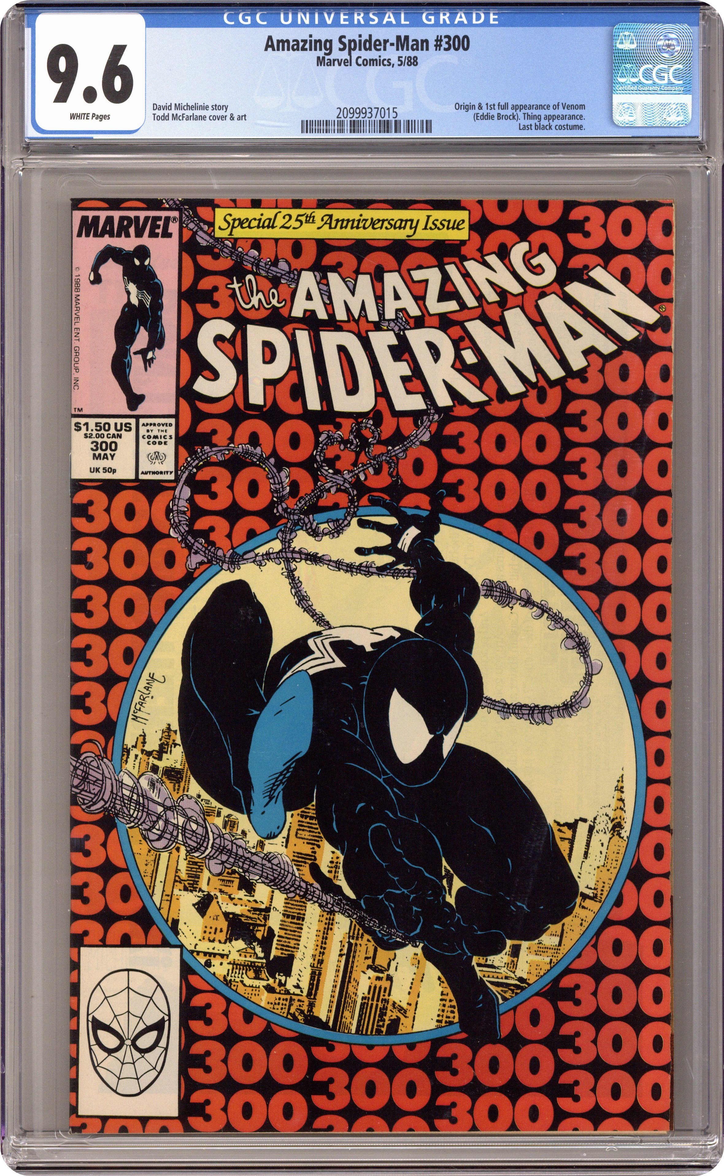 Direct Edition. Giant-sized 25th anniversary issue. First full appearance of Venom in "Venom!", script by David Michelinie, art by Todd McFarlane; Spidey's old alien costume has merged with reporter Eddie Brock who thinks his career was ruined by Spider-Man and the symbiote of the two, Venom, takes on the web slinger; At MJ's request, Spidey returns to the blue and red costume as she now finds his black duds way too creepy; This is the last issue in which Spider-Man appears in his black costume; Thing (of the Fantastic Four) cameo.. Stan's Soapbox Special in place of letters page: Full page editorial by Stan on the occasion of Spider-Man's 300th issue. 52 pgs., full color. Cover price $1.50. Grade: CGC 9.6 explanation of grade Condition: Used (collectible)
