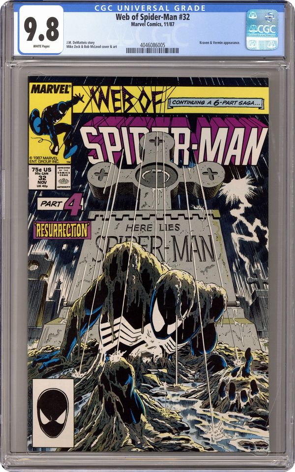 Direct Edition. Kraven's Last Hunt - Part 4 of 6 - "Resurrection" Story by J. M. DeMatteis. Art by Mike Zeck and Bob McLeod. Story continues from Spectacular Spiderman 131. Spider-Man finally awakens from his drug-induced coma and busts out of his coffin! Peter quickly returns to his wife, Mary Jane, who has not seen him in two weeks. Meanwhile, Kraven has been committing crimes in New York City, while dressed as Spider-Man. Story continues in Amazing Spiderman 294. Cover price $0.75. Grade: CGC 9.8 explanation of grade Condition: Used (collectible)