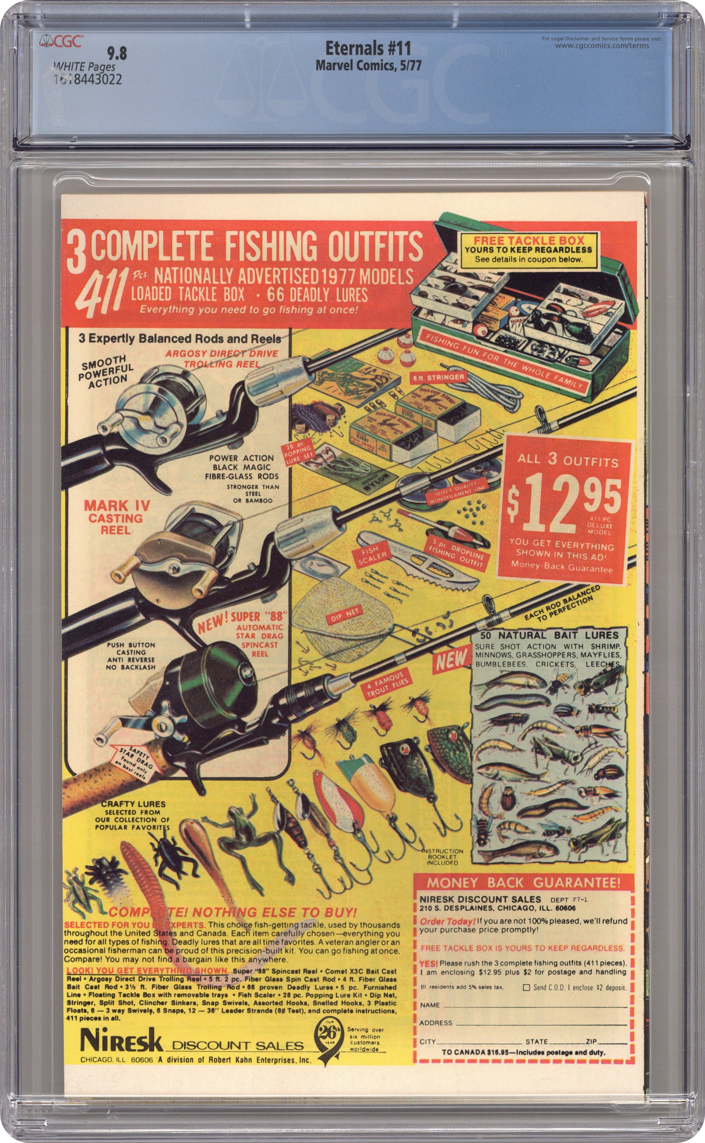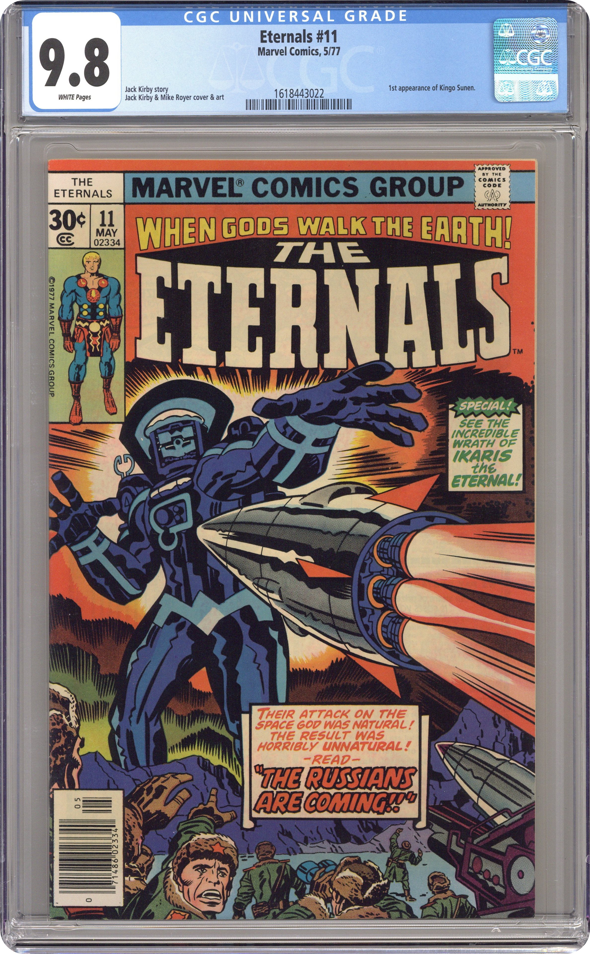 "The Russians Are Coming!" Written by Jack Kirby. Pencils by Jack Kirby. Inks by Mike Royer. The U.S.S.R., frightened by the sudden appearance of the space gods, launches an all-out nuclear assault. Their attack on the space god was natural! The result was horribly unnatural. Notes: Letter to the editor from comics writer Mike Barr. First appearance of Aginar, the Delphan Brothers, Druig, Kingo Sunen, Valkin, and Zarin. Cover price $0.30. Grade: CGC 9.8 explanation of grade Condition: Used (collectible)