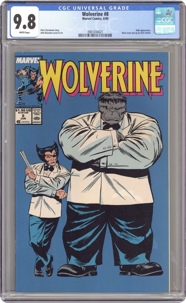 Direct Edition. Part 2 of 2 - "If It Ain't Broke...!" Guest-starring the Incredible Hulk. Written by Chris Claremont. Art by John Buscema . In a humorous turn of events, using the Hulk's brute strength to do his dirty work for him, Wolverine tricks the Grey Goliath into trashing Coy's slave ring and cocaine operation. Rob Liefeld art on back cover. Cover price $1.50. Grade: CGC 9.8 explanation of grade Condition: Used (collectible)