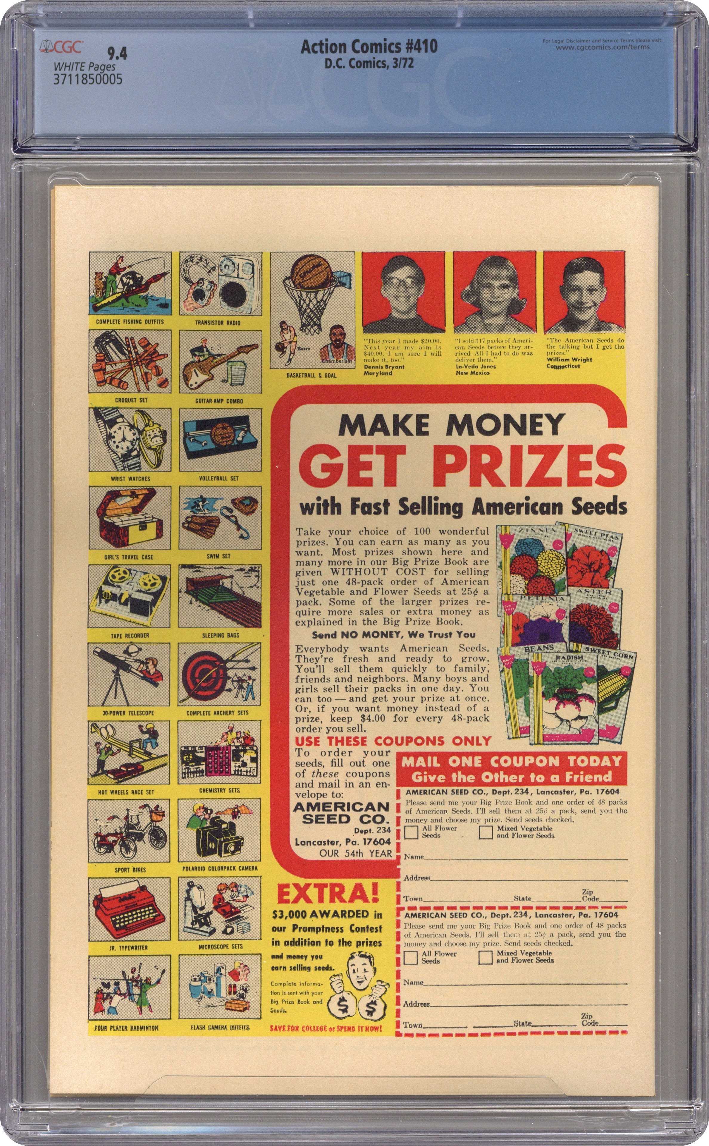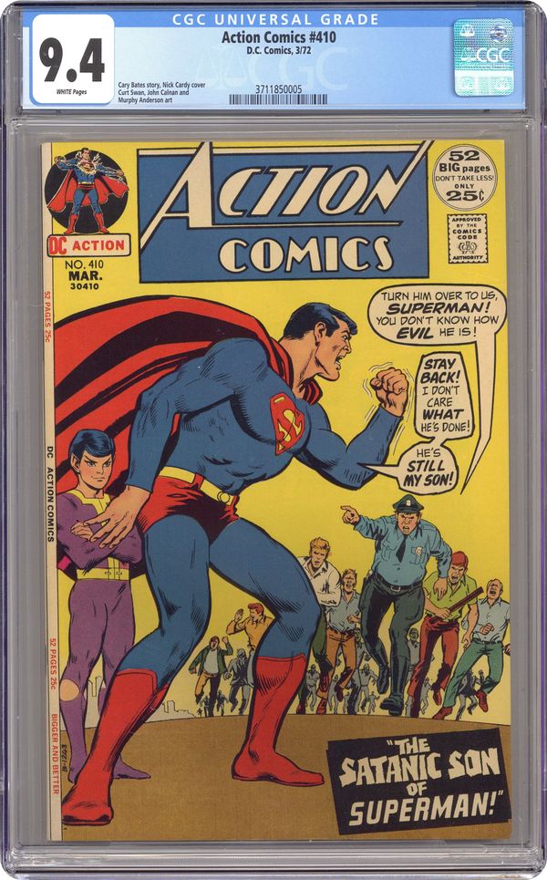 Ended Dec 29 2023 Winning Bid $75 52-page giant. Cover by Nick Cardy. "The Satanic Son of Superman," script by Cary Bates, pencils by Curt Swan, inks by Murphy Anderson; Superman learns that his son, Krys, has caused many disasters over his 10 year lifetime. "Healing Hands from Beyond!", script by Cary Bates, pencils by John Calnan, inks by Murphy Anderson; An ancient Indian magic allows Dr. Navarro to perform a complicated surgery. Classic Teen Titans reprint, "The Secret Olympic Heroes," script by Bob Haney, art by Nick Cardy; Speedy and the Titans locate a missing Olympic athlete. Letter to the editor from comics writer Bob Rozakis. The letters page also contains a statement of ownership - average print run 585,000; average print run 325,618. 52 Pages, Full Color. $0.25 Cover price $0.25. Grade: CGC 9.4 explanation of grade Condition: Used (collectible)