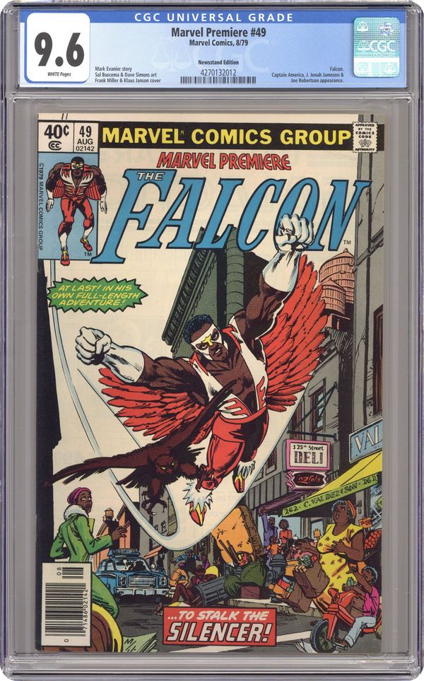 Cover pencils by Frank Miller, inks by Klaus Janson. Sound of the Silencer, script by Mark Evanier, pencils by Sal Buscema, inks by Dave Simons; Bodavian diplomat, Sigjid Roskoff, is killed by the masked villain, the Silencer; The Falcon figures out that the murderer is Count Barzon, a fellow Bodavian who killed Roskoff for political reasons and who used the Silencer identity to throw the authorities off his trail. Brief Captain America appearance. Cameo from J. Jonah Jameson (from Spider-Man comics). 36 pgs. $0.40. Cover price $0.40. Grade: CGC 9.6 explanation of grade Condition: Used (collectible)