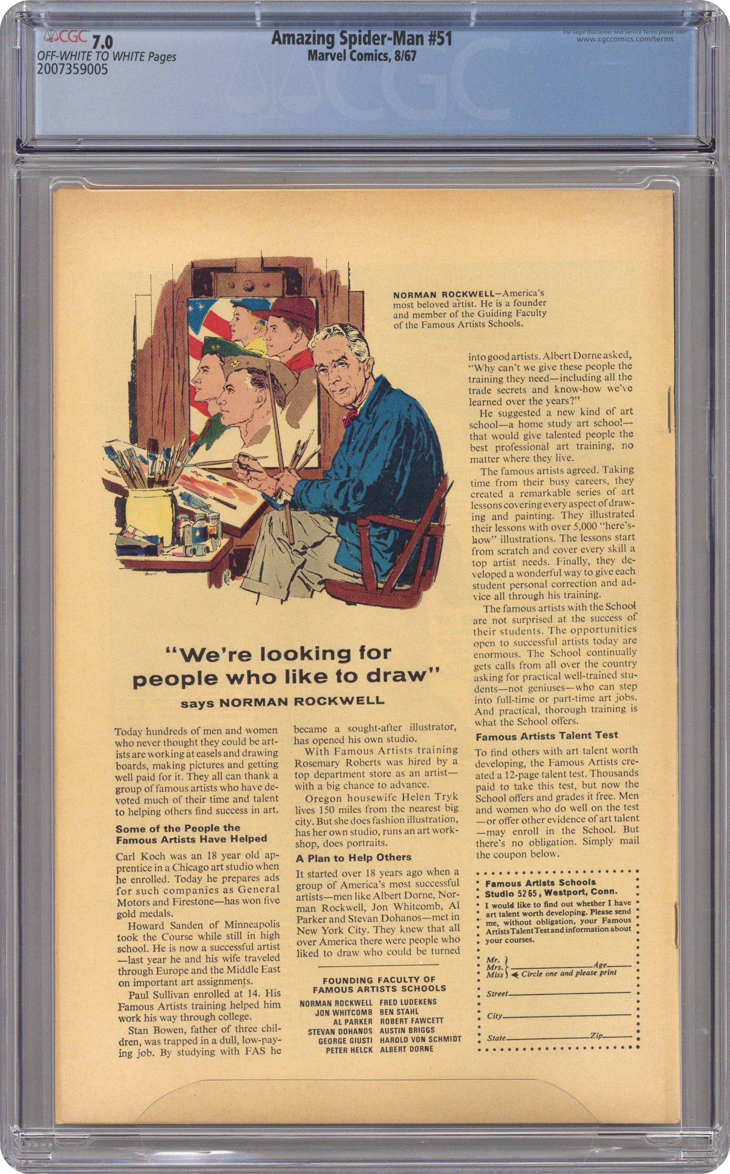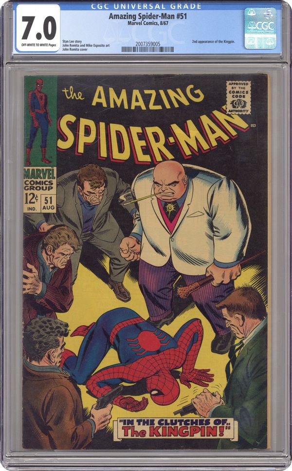 Cover by John Romita Sr. Second appearance of the Kingpin in In the Clutches of...the Kingpin!, script by Stan Lee, pencils by John Romita, inks by Mike Esposito (as Mickey Demeo); When the Kingpin orders that J. Jonah Jameson be silenced for his negative press on Fisk's illegal activites, Spidey swings in to save the EIC; But can the Wallcrawler take the big guy in a one-on-one brawl? Reprinted in Marvel Tales # 36. 36 pages, full color. Cover price $0.12. Grade: CGC 7.0 explanation of grade Condition: Used (collectible)