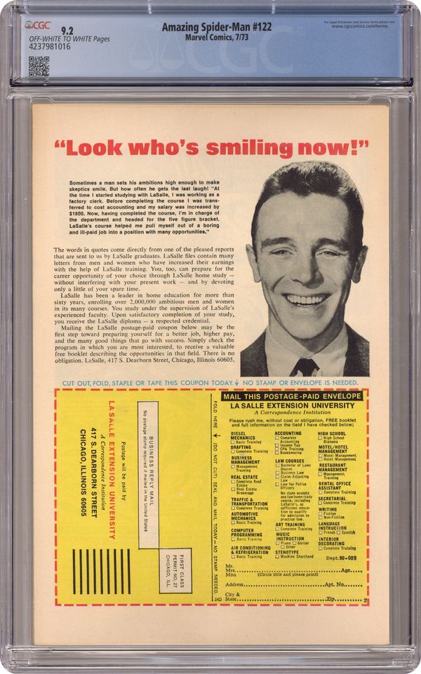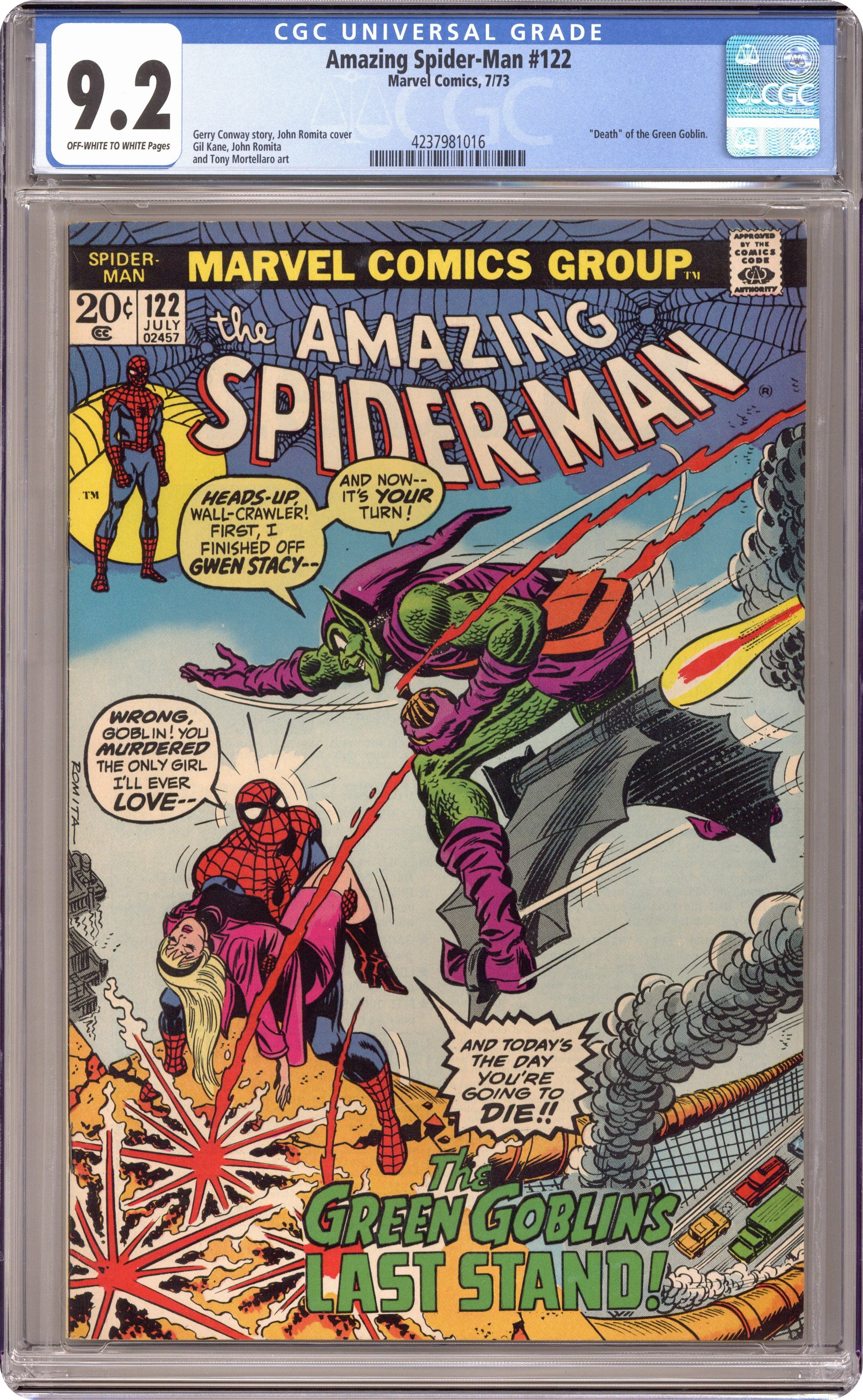 Death of the Green Goblin (aka Norman Osborn) in "The Goblin's Last Stand!" Part 2 of 2. Script by Gerry Conway. Pencils by Gil Kane. Inks by John Romita and Tony Mortellaro (backgrounds). Cover by John Romita. In unfathomable fashion atop the Brooklyn Bridge, Gwen Stacy perished at the hands of the Green Goblin. Spider-Man is devastated. And he furiously lashes out at the goblin, but the purple and green-clad killer gets away! However, a while later, the wall-crawler receives a tip from Joe Robertson about Norman Osborn's whereabouts. And in an abandoned and decrepit warehouse, the Amazing Spider-Man and the Green Goblin fight for the final time! At the end of their epic battle, Peter Parker painfully realizes that revenge is bittersweet. The passing of the goblin won't bring back Gwen. He must find a way to move forward with his life. Perhaps Mary Jane Watson will help. Cameo appearances by Harry Osborn and J. Jonah Jameson. (Notes: The stunning death scene of the Green Goblin inspired a similar moment in the2002 Spider-Man movie. This issue was reprinted in Marvel Tales #99 and again in issue 192.) 36 pages. Cover price $0.20. Grade: CGC 9.2 explanation of grade Condition: Used (collectible)