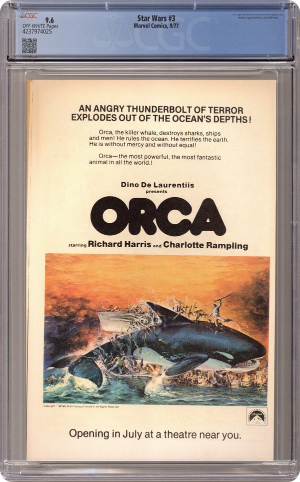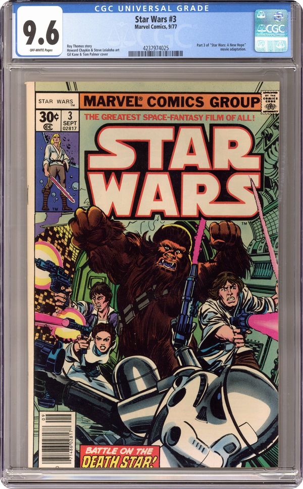 1st printing, standard 30 Cent Newsstand Edition with UPC. A New Hope: Part 3 of 6. "Death Star!" Based on the screenplay by George Lucas. Adapted by Roy Thomas. Art by Howard Chaykin and Steve Leialoha. The evil Galactic Empire tests its ultimate weapon on Princess Leia's homeworld with devastating results. Meanwhile, Ben Kenobi begins Luke Skywalker's training in the ways of the force. However things take a turn for the worse when the Millennium Falcon is captured within the unrelenting grasp of the Death Star's tractor-beam. Now, it's up to this small motley band of heroes to mount a daring rescue attempt of the Princess from within the very bowels of the Empire's most powerful weapon. Cover price $0.30. Grade: CGC 9.6 explanation of grade Condition: Used (collectible)