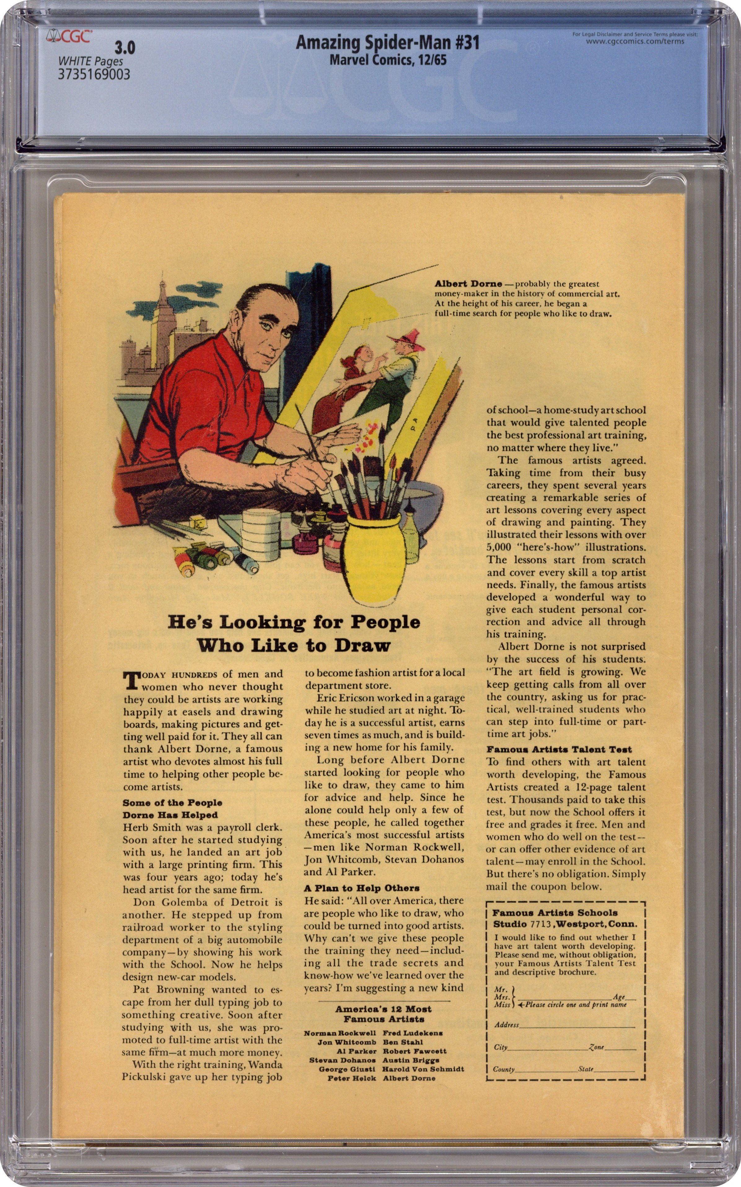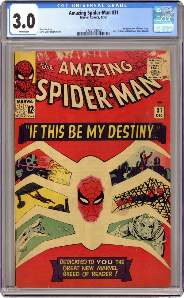 Cover by Steve Ditko. First appearances of Gwen Stacy, Harry Osborn, and Professor Warren. First appearance of the Master Planner (revealed in issue 32 to be Doctor Octopus) in "If This Be My Destiny, script by Steve Ditko (plot) and Stan Lee (script), art by Steve Ditko; Aunt May falls deathly ill on Peter's first day of college. Meanwhile, the Master Planner is stealing scientific gadgets. Marvel Bullpen Bulletins, art by Steve Ditko and Marie Severin; Bullpen Bulletins page discussing staff; Marvel Checklist; ads for Spider-Man T-Shirt and MMMS. Letter to the editor from comics writer Don McGregor. Reprinted in Marvel Tales # 24 and 170. 36 pgs., full color. $0.12. Cover price $0.12. Grade: CGC 3.0 explanation of grade Condition: Used (collectible)