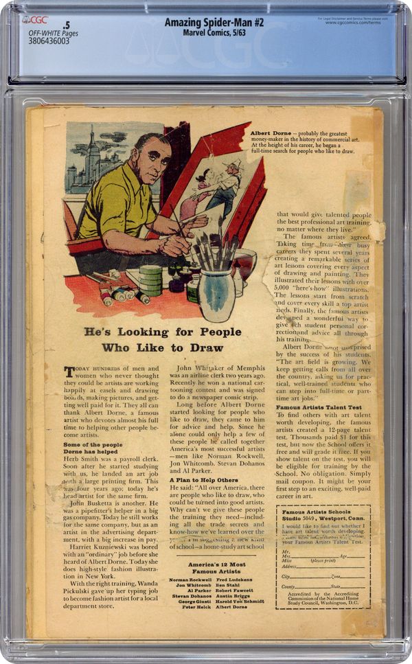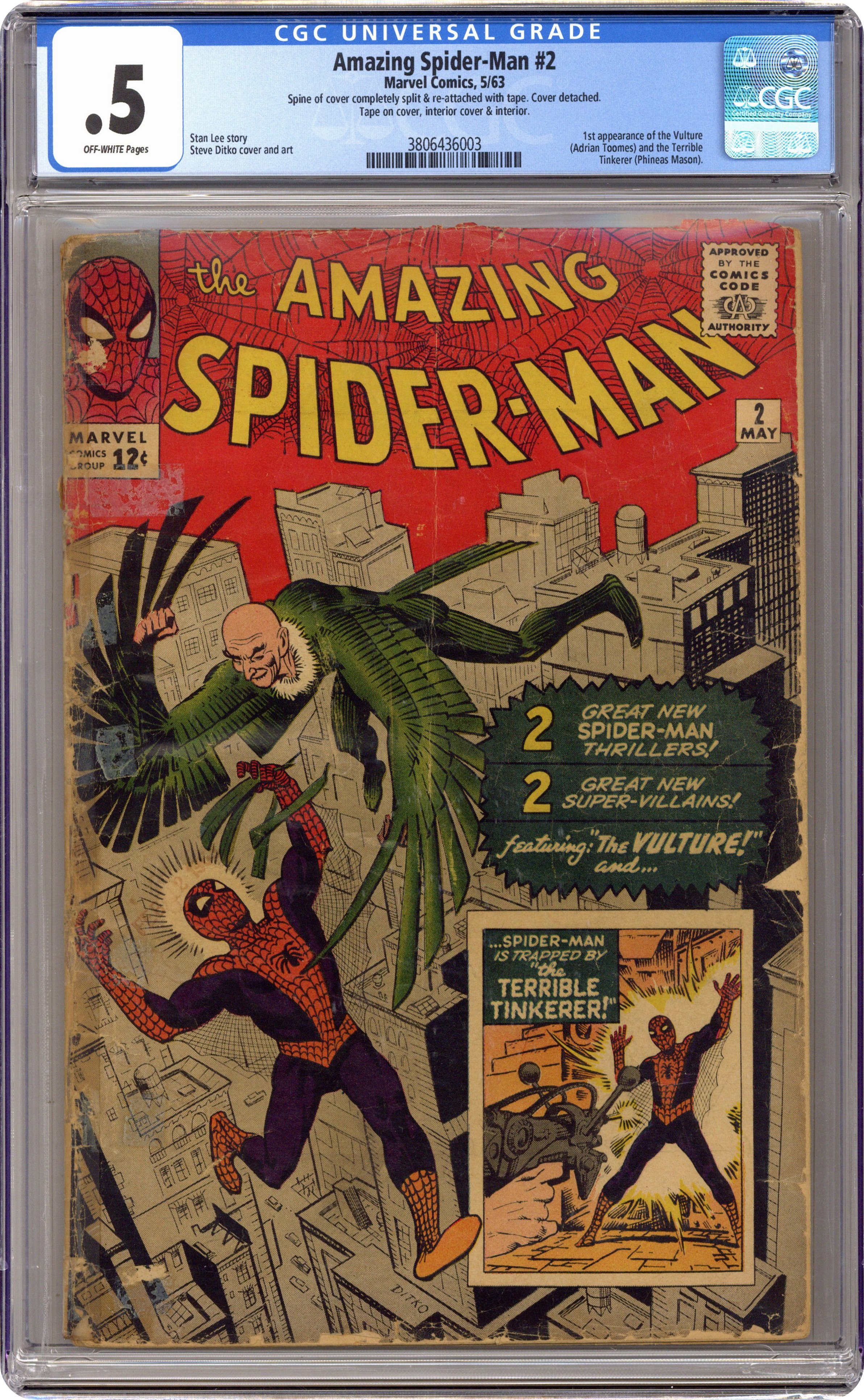 Cover art by Steve Ditko. First appearance of the Vulture in Duel to the Death with the Vulture!, script by Stan Lee, art by Steve Ditko; The Vulture is so confident in his abilities that he announces his plans to steal a diamond shipment to the police; When Spider-Man hears this he decides to stop the Vulture. The Uncanny Threat of the Terrible Tinkerer!, script by Stan Lee, art by Steve Ditko; When Peter Parker discovers some alien modifications to a professor's radio he tracks down a group of aliens with plans to take over the Earth. Reprinted in Marvel Tales # 139. 36 pgs. $0.12. Cover price $0.12. Grade: CGC 0.5 explanation of grade Condition: Used (collectible)