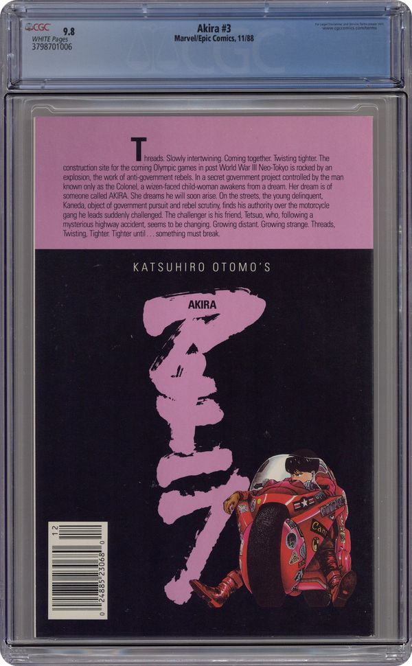 Kaneda gets caught up in the rebels' attempt to find the mysterious Akira; meanwhile, Tetsuo is going through some strange and terrifying changes. The first English translation of Katsuhiro Otomos influential manga series. Story, art and cover by Otomo. Color by Steve Oliff. Also includes an article about the Akira anime. Mature readers. Cover price $3.50. Cover price $3.50. Grade: CGC 9.8 explanation of grade Condition: Used (collectible)