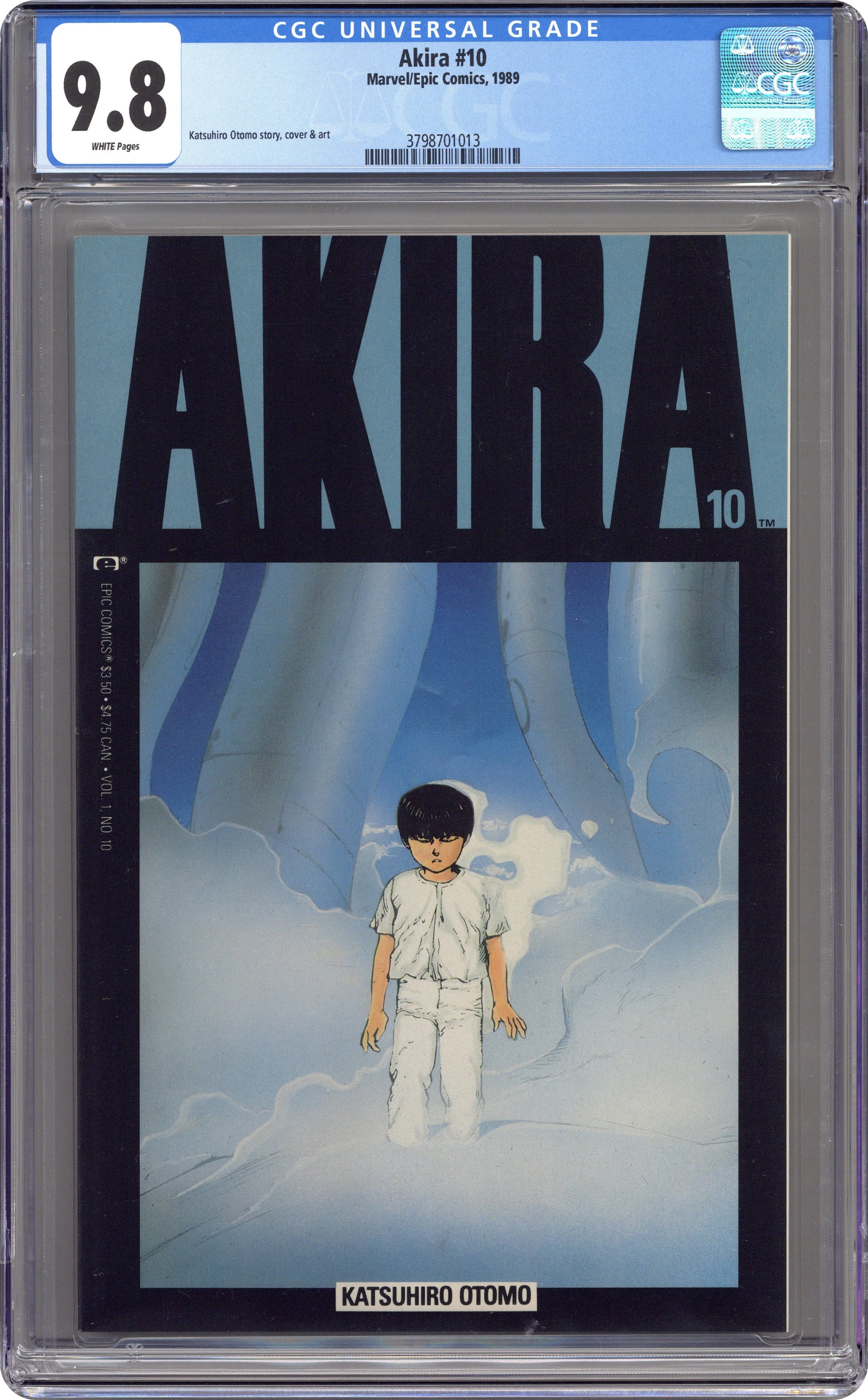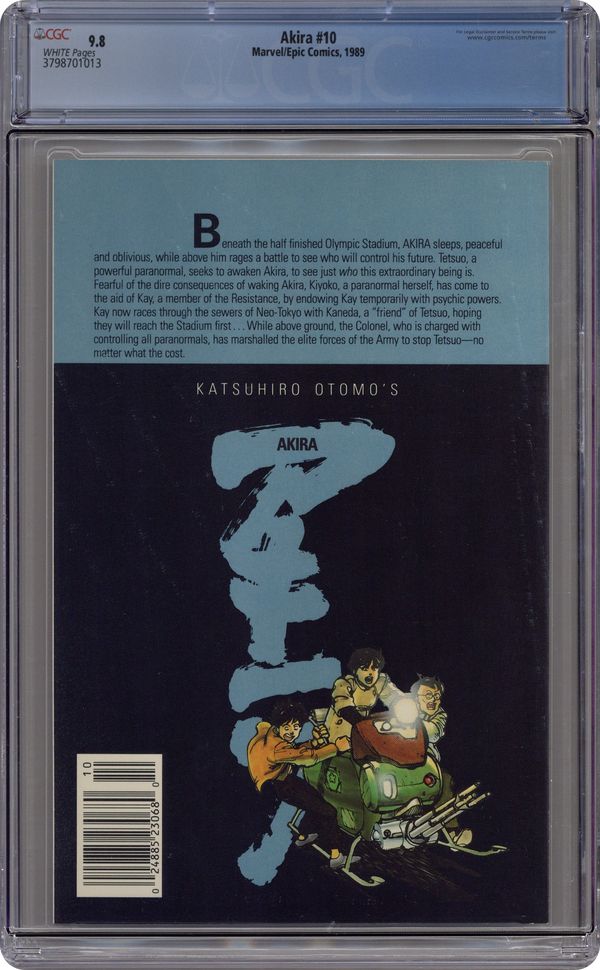 A blast rocks the secret government project as Kaneda and Kay, along with the Colonel's forces, make a last-ditch effort to stop Tetsuo from reaching the suspended animation chamber that houses the mysterious Akira. The first English translation of Katsuhiro Otomos influential manga series. Story, art and cover by Otomo. Color by Steve Oliff. Also includes an article on the Art of Akira book. Mature readers. Cover price $3.50. Cover price $3.50. Grade: CGC 9.8 explanation of grade Condition: Used (collectible)