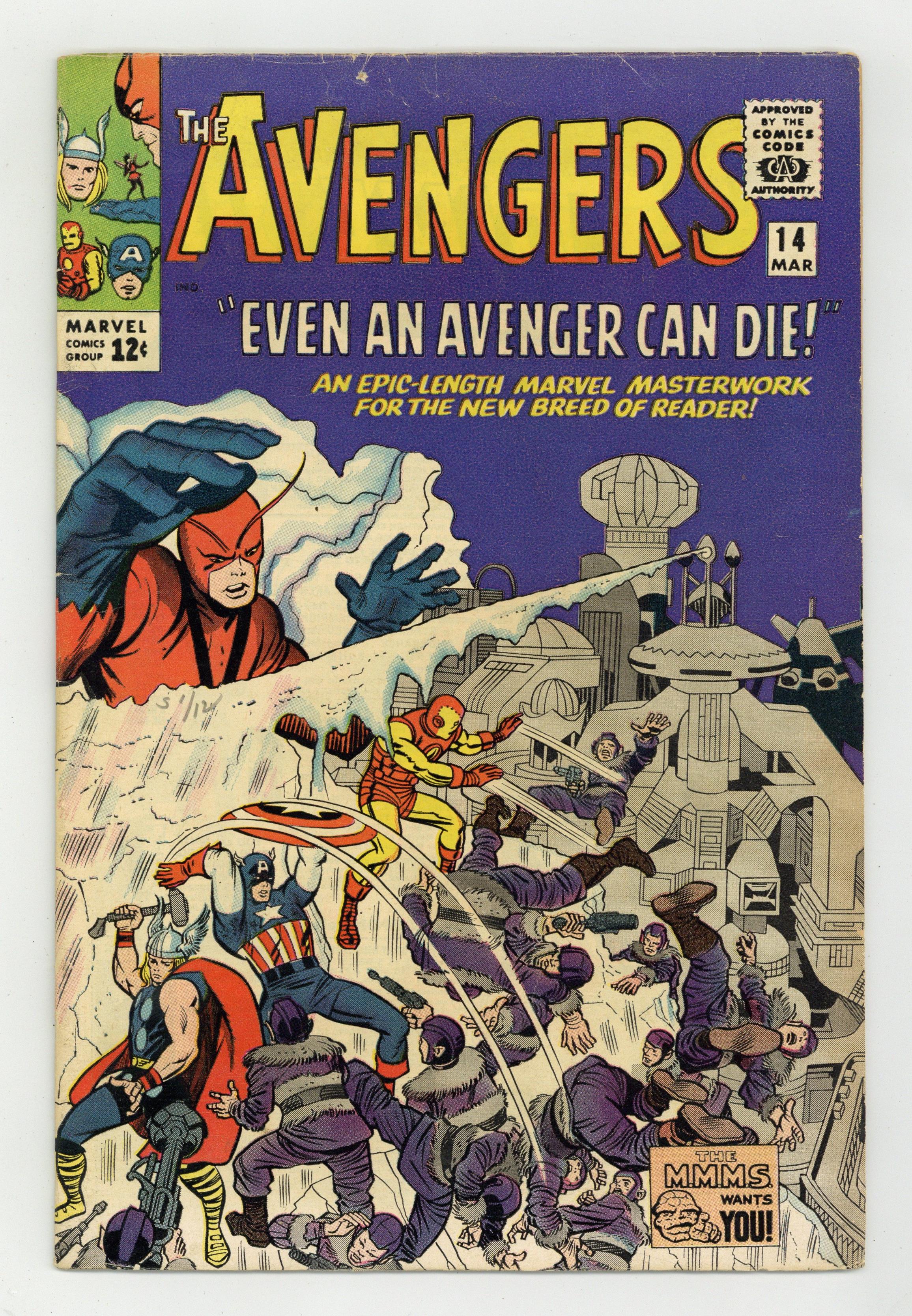 Cover pencils by Jack Kirby, inks by Chic Stone. Even Avengers Can Die!, script by Stan Lee (plot), Larry Ivie [as Paul Laiken] (script), and Larry Lieber (script), pencils by Jack Kirby (layouts) and Don Heck (pencils), inks by Chic Stone; In order to save the Wasp's life, the Avengers seek out the help of Dr. Svenson, only to find he's been replaced by an alien from the planet Kallu. Avengers Roll Call: Captain America, Thor, Iron Man, Giant Man, Wasp, and Rick Jones. First and only appearance of the villainous Ogor and the Kallusians. Guest appearance by the Watcher. Reprinted in Marvel Triple Action #8. 36 pgs. $0.12. Cover price $0.12. Grade: VG- 3.5 explanation of grade Condition: Used (collectible)
