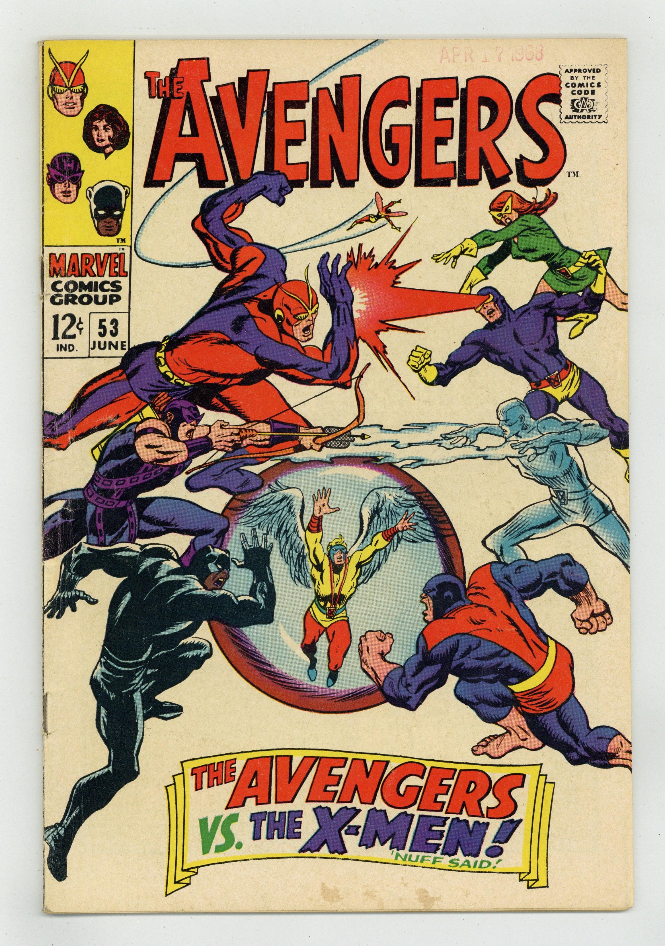 "In Battle Joined!" Guest-starring the X-Men. Script by Roy Thomas.Pencils by John Buscema. Inks by George Tuska. Cover by John Buscema and George Tuska. Story continues from Uncanny X-Men (1963 1st series) #45. After rendezvousing with the Angel, Earth's Mightiest Heroes arrive on Magneto's Atlantic Island ready to take down the Master of Magnetism! However the powerful mutant has a plan to turn the captive X-Men against the Avengers! And in Magneto's lair, Magneto's plan usually works! So it's the Mighty Avengers vs. the Uncanny X-Men for the freedom of the world! Duringthe chaotic battle, Pietro and Wanda look for a way to get off the island! Maybe the Toad will help them! But first he has a surprise for his magnetic master! Avengers Lineup: Black Panther, Goliath, Hawkeye, and the Wasp. X-Men Lineup: Angel, Beast, Cyclops, Iceman, and Marvel Girl. (Notes: Magneto appears next in Uncanny X-Men #62. He battles Earth's Mightiest Heroes again in Avengers 110 & 111. Quicksilver and the Scarlet Witch appear next in Amazing Spider-Man #71. They return to the team in Avengers #75. This story was reprinted in Marvel Triple Action #46 and also in Avengers 350.) 36 pages. Cover price $0.12. Grade: VG- 3.5 explanation of grade Condition: Used (collectible)