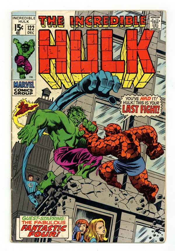 Cover art by Herb Trimpe. The Hulk's Last Fight!, script by Roy Thomas, art by Herb Trimpe; Despairing after he turns into his human alter ego and finds that the Hulk has destroyed a train for no apparent reason, Bruce Banner finds a newspaper headline that asks him to come to New York as Mr. Fantastic believes that he has discovered a way to do away with the Hulk for good; Riding the rails to the Big Apple, Bruce tries to jot some notes of his own regarding Reed's process and secures them to his waist as he finds himself transforming once again into the Hulk to face down some pesky hoboes; By the time he makes it to the Baxter Building, our hero is once again in the form of Bruce Banner but an irate security guard makes his metabolism race and he changes into his monstrous alter ego; During Hulk's battle with the F.F., Sue notices as the pouch with Bruce's notes falls from the Hulk's waist and the Thing is called on to keep the jade giant occupied while Reed uses the new information to modify his weapon design in trying to banish the Hulk for good. 36 pgs. $0.15. Cover price $0.15. Grade: VG+ 4.5 explanation of grade Condition: Used (collectible)
