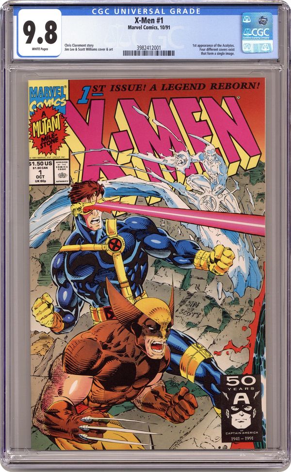 Ended Jun 13 2024 Winning Bid $76 Direct Edition. Cyclops/Wolverine/Iceman cover. Cover pencils by Jim Lee, inks by Scott Williams. Rubicon, script by Jim Lee (Co-Plot) and Chris Claremont, pencils by Jim Lee, inks by Scott Williams; Magneto forms the Acolytes and proclaims Asteroid M a haven for mutants everywhere; But the rest of the world doesn't see it that way; Nick Fury cameo. 2-page pin-up: gallery of X-Men villains. X-Men Sketchbook by Jim Lee. Cover price $1.50. NOTE: Cover C connects to covers 1A, 1B, and 1D to form a single giant image. Cover price $1.50. Grade: CGC 9.8 explanation of grade Condition: Used (collectible)