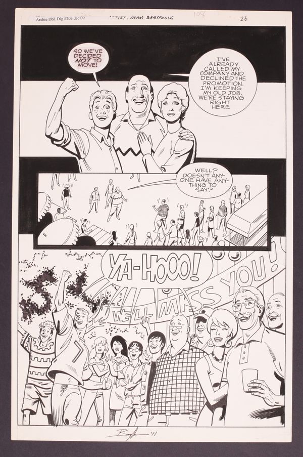 What a page! The triumphant ending to the last "New Look" Archie story, an initiative that saw the long running teen series move away from its iconic art style to tell more grounded, 'mature' stories. The final arc was its most melodramatic with the Andrews family being forced to leave town when Mr. Andrews gets a promotion. Of course, even in the more 'real' Riverdale, happy endings are a must and on this great page we see the town celebrate the family's decision to remain in Riverdale. Even Mr. Lodge is happy Archie is staying! Signed by Breyfogle in bottom margin. Pencil and ink on comic art board. 11" x 17", B&W.