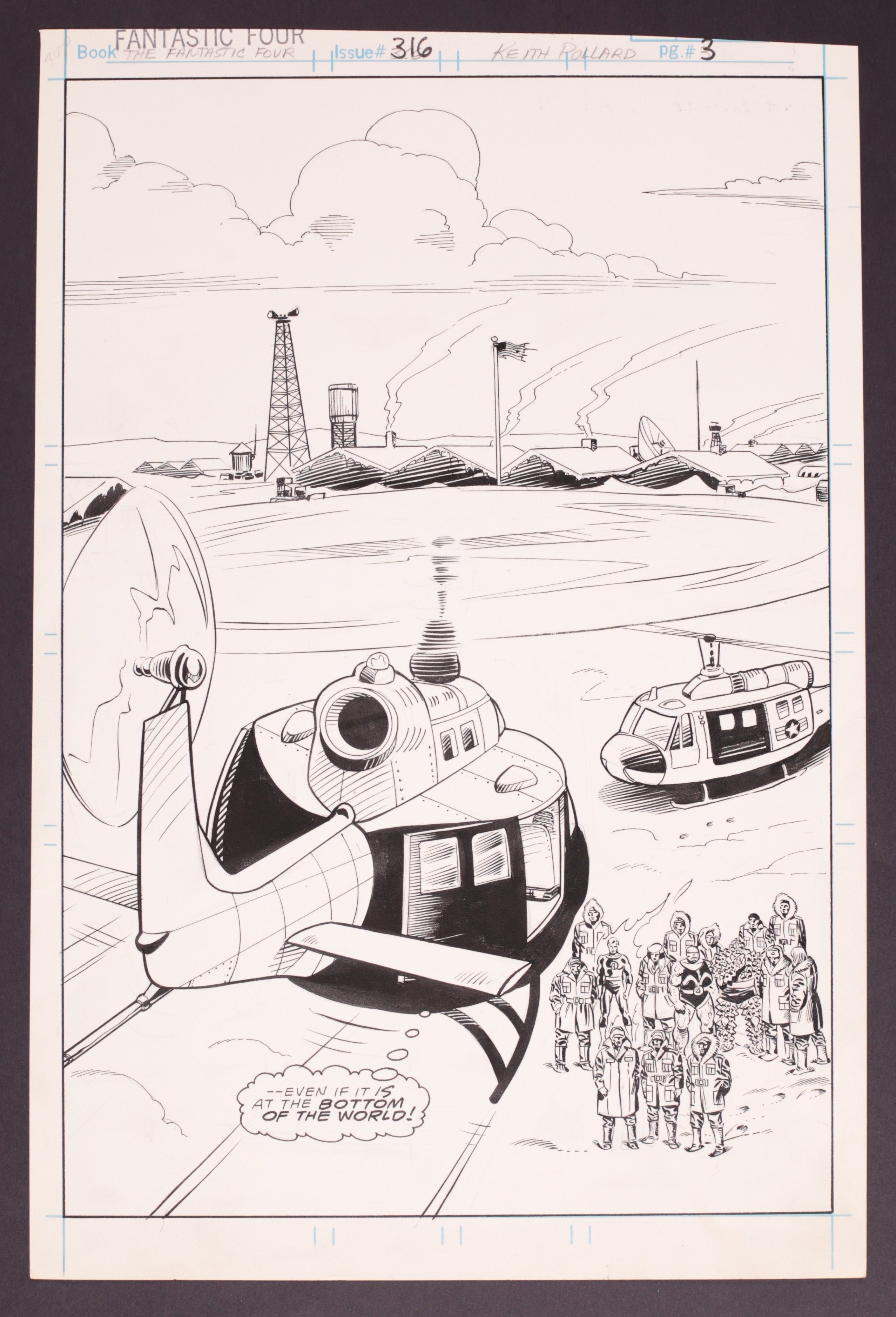 A scene-setting splash page that sees Alicia Masters' helicopter arriving in the frozen wasteland of the South Pole as the FF and their support team look on. Signed by Sinnott on the reverse. Pencil and ink on Marvel Comics art board. 11" x 16 1/4", B&W. Also included is a copy of the original issue.