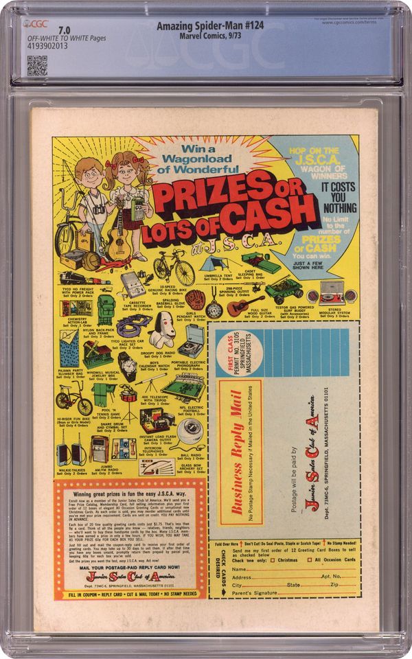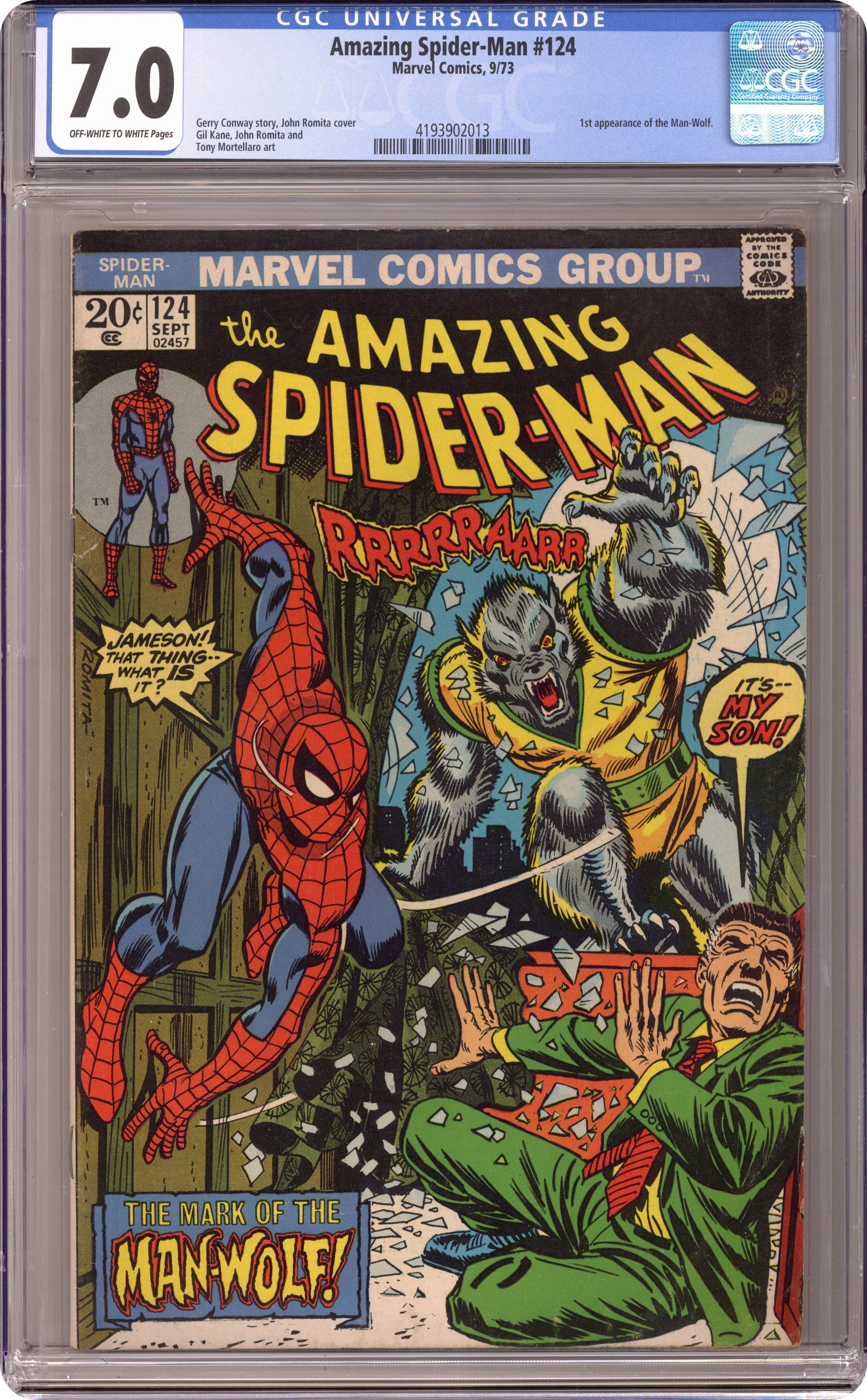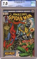 First appearance of the Man-Wolf (aka John Jameson) in "The Mark of the Man-Wolf" Part 1 of 2. Script by Gerry Conway. Pencils by Gil Kane. Inks by John Romita and Tony Mortellaro (backgrounds). Cover by John Romita. While web-swinging through the city, Spider-Man stops to look at the local newspapers. He becomes angry when the Daily Bugle is the only newspaper calling him a murderer -- in connection with the death of Norman Osborn! The livid wall-crawler rushes to JJJ's apartment, but someone else gets their first: the Man-Wolf! Oh my! As shown on the terrific cover, Spider-Man battles the Man-Wolf to save J. Jonah Jameson! First appearance of Kristine Saunders. Cameo appearances by Mary Jane Watson, Flash Thompson, and Joe Robertson. (Notes: In the letters page, the web-slinger's fans react to Gwen Stacy's death. This story was reprinted in Marvel Tales 101.) 36 pages. Cover price $0.20. Grade: CGC 7.0 explanation of grade Condition: Used (collectible)