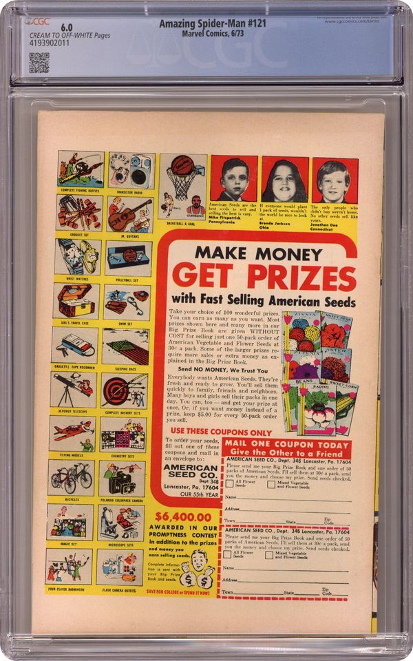 Death of Gwen Stacy in "The Night Gwen Stacy Died" Part 1 of 2. Script by Gerry Conway. Pencils by Gil Kane. Inks by John Romita and Tony Mortellaro(backgrounds). Cover by John Romita. One of the greatest Spider-Man stories of all-time! Peter Parker returns from Canada to find his world on fire! His roommate Harry Osborn has overdosed again, and Norman Osborn is blaming Peter for his son's relapse. As the situation becomes more and more stressful, Norman recalls his super-villain past -- and the Green Goblin lives once more! However, this version of the goblin is more sick and twisted than previous ones. And to get revenge against the web-slinger, the goblin kidnaps Gwen and takes her to the top of the Brooklyn Bridge. Sothen and there, the Amazing Spider-Man and the Green Goblin fight for the life of Gwen Stacy. But sometimes the good guys don't win. A heartbreaking ending. Cameo appearances by Mary Jane Watson, J. Jonah Jameson, and Joe Robertson. (Notes: This two-part story was a watershed event in the history of Marvel Comics. This issue was reprinted in Marvel Tales #98 and again in issue 192.) 36 pages. Cover price $0.20. Grade: CGC 6.0 explanation of grade Condition: Used (collectible)