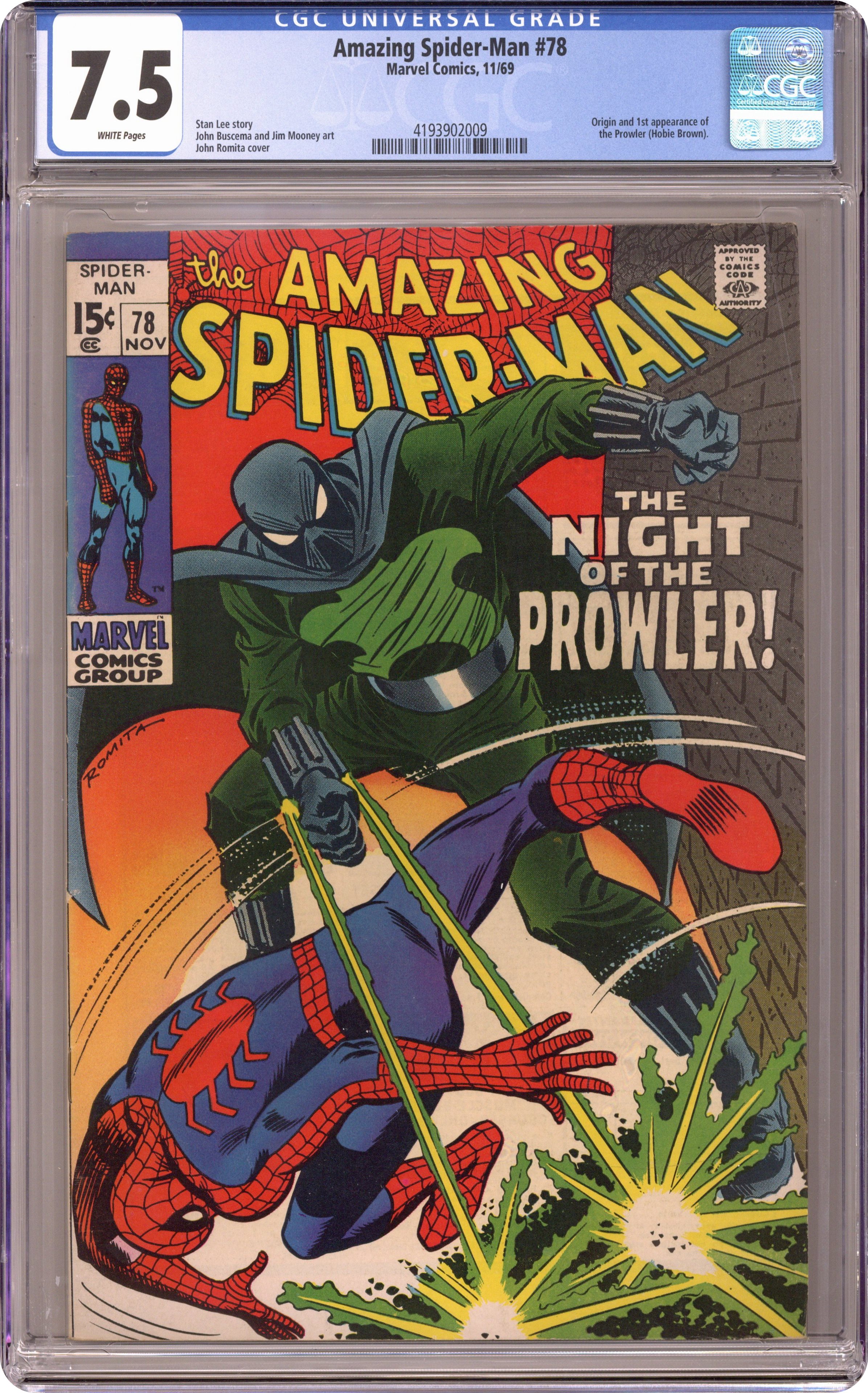 First appearance of the Prowler in "The Night of the Prowler!" Part 1 of 2. Script by Stan Lee. Art by John Buscema (layouts) and Jim Mooney (finishes). Cover by John Romita. In order to make a name for himself, a down on his luck window washer named Hobie Brown becomes a super-villain. And using his own ideas and equipment, Hobie creates weapons and a costume -- and the Prowler is born! In the meantime, Peter Parker is also feeling downtrodden after seeing Gwen Stacy and Flash Thompson having coffee together. Later that evening, Peter stops by the Daily Bugle hoping for a payday advance. But instead he sees the Prowler stealing the Bugle's payroll bag! And suddenly it's the Prowler vs. Peter Parker...with J. Jonah Jameson standing by! Origin of the Prowler. Cameo appearances by Harry Osborn, Joe Robertson, and Mindy Brown. (Note: This story was reprinted in Marvel Tales #59.) 36 pages. Cover price $0.15. Grade: CGC 7.5 explanation of grade Condition: Used (collectible)