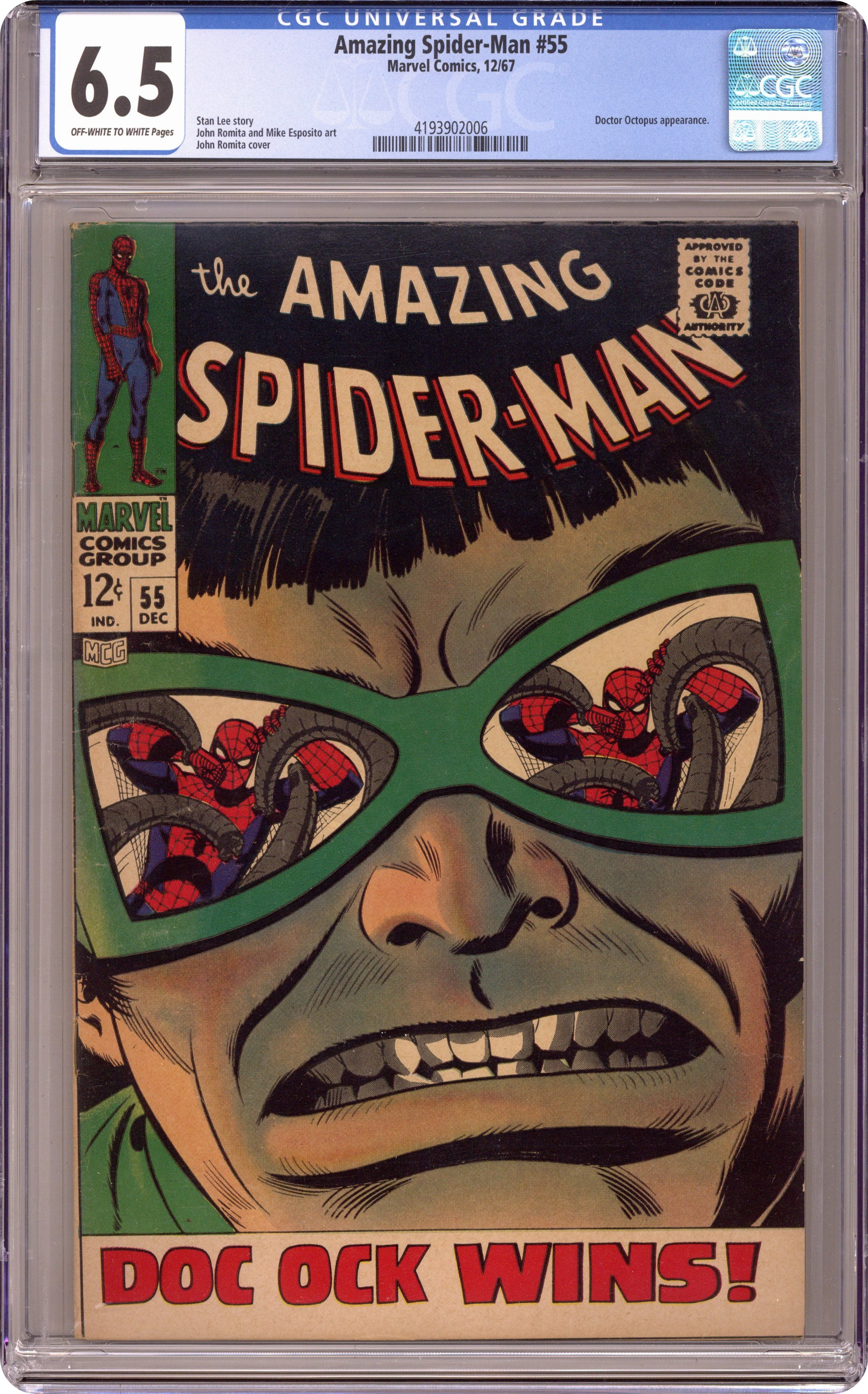 Spidey is on a rampage - looking for Doc Ock ever since Aunt May collapsed. Meanwhile, Doc Ock is after the Nullifier again - and he finds it and uses it against Spider-Man with most unexpected results. Spidey can't remember who he is, but will he believe Dr. Octopus when the doc tells him they are on the same team???"Doc Ock Wins." Script by Stan Lee, pencils by John Romita Sr., inks by Mike Esposito as "Mickey Demeo." Romita cover. Reprinted in Marvel Tales # 40. 36 pgs. Cover price $0.12. Grade: CGC 6.5 explanation of grade Condition: Used (collectible)